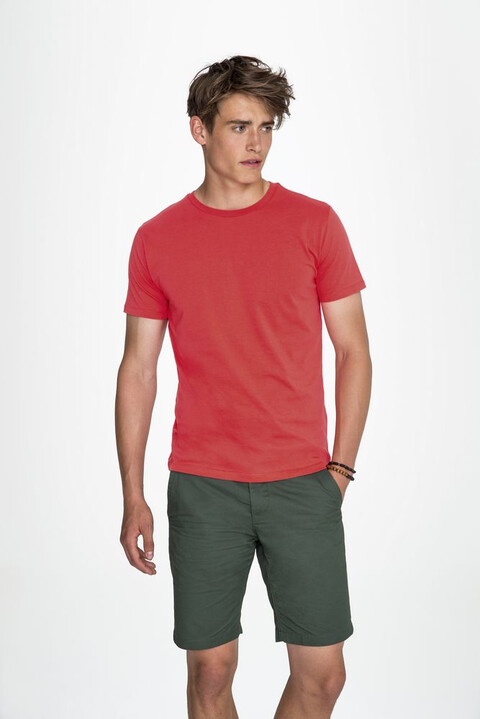 Кроеная мужская футболка с круглой горловиной. Ворот в тонкую резинку с укрепляющей тесьмой. Облегающий силуэт.