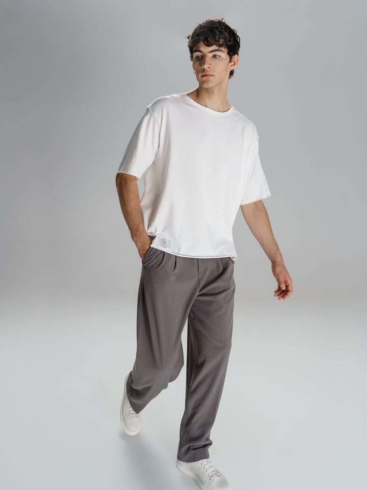Футболка унисекс свободной посадки Vozduh создана для тех, кто следит за трендами и ценит комфорт. Необработанные края рукавов и низа изделия добавляют ему оригинальности и легкой небрежности, а боковые вставки создают притягательный летящий силуэт.