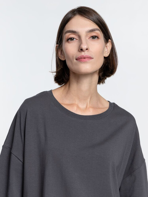 Объемная кроеная футболка с удлиненным рукавом из гребенного хлопка с эластаном не стесняет движений и создает модный расслабленный силуэт.