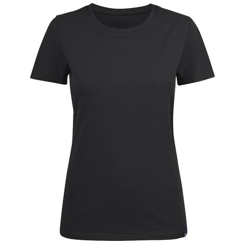 Женская футболка с круглым вырезом. Двухслойная резинка предохраняет воротник от деформации после стирки.