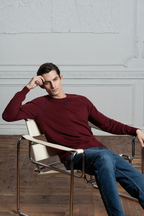 Джемпер чулочной вязки с круглым воротом и контрастной строчкой.