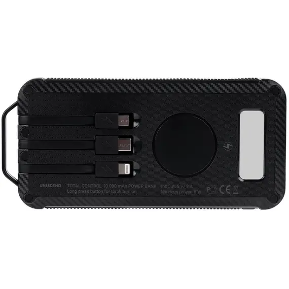 Total Control — настоящий outdoor-аккумулятор с ударопрочным корпусом и защитой от пыли и брызг, который не страшно взять в поход. Область для беспроводной зарядки и 3 встроенных кабеля с разъемами Micro USB, Type C и Lightning позволяют удобно заряжать разные типы устройств, а солнечная батарея просто не позволит остаться совсем без связи. Яркий фонарик осветит путь или послужит светильником в палатке.