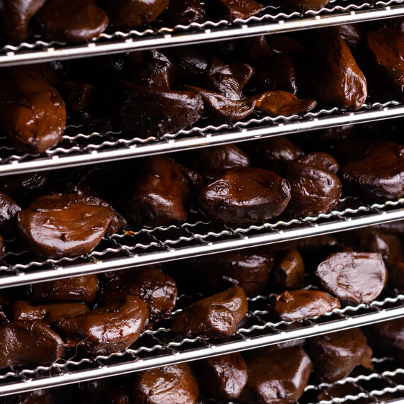 Мы разработали собственную технологию производства. В течение 30-45 дней в герметичной камере происходит особая ферментация отборных зубчиков чеснока. Выделяющийся сок циркулирует через конденсаторы, насыщаясь полезными веществами. На выходе мы получаем сразу два продукта: собственно черный чеснок и жидкий концентрат.