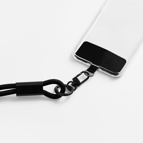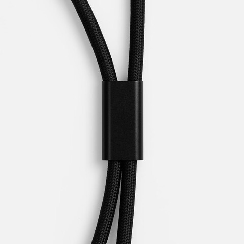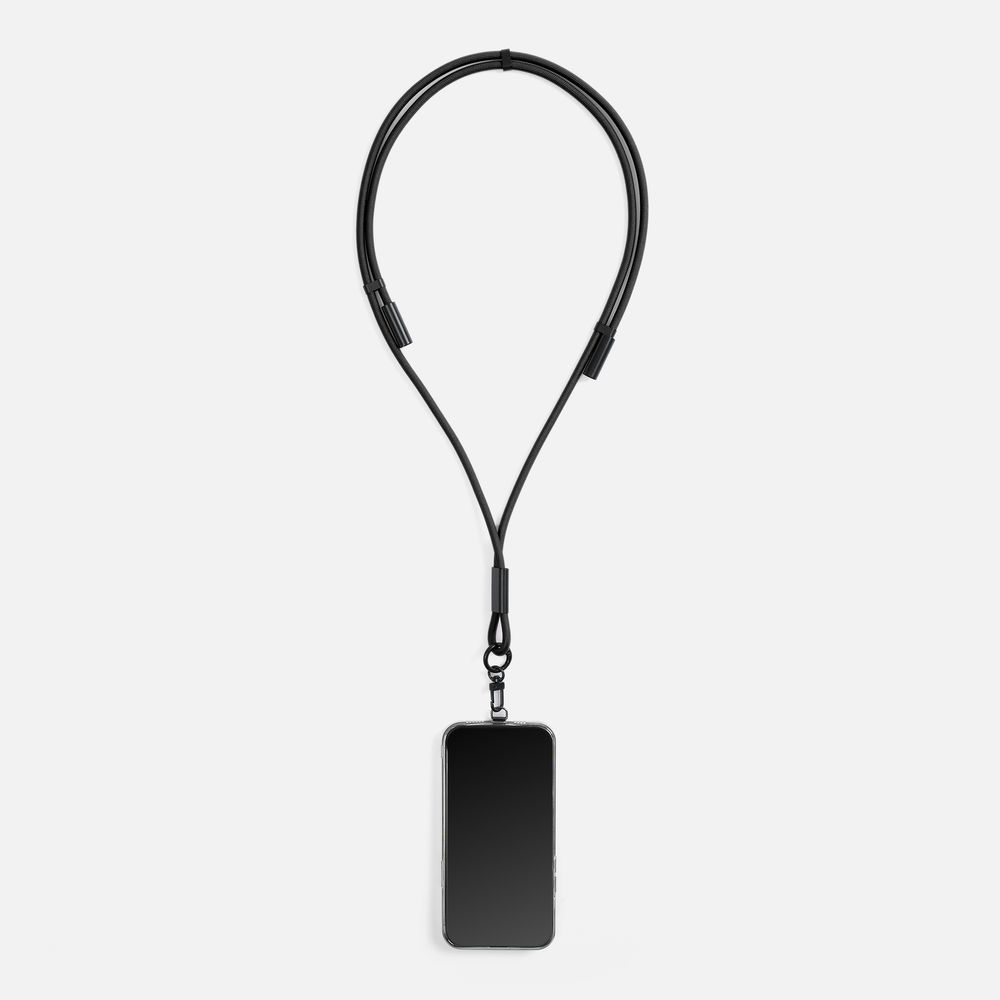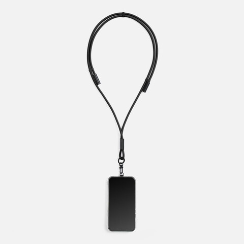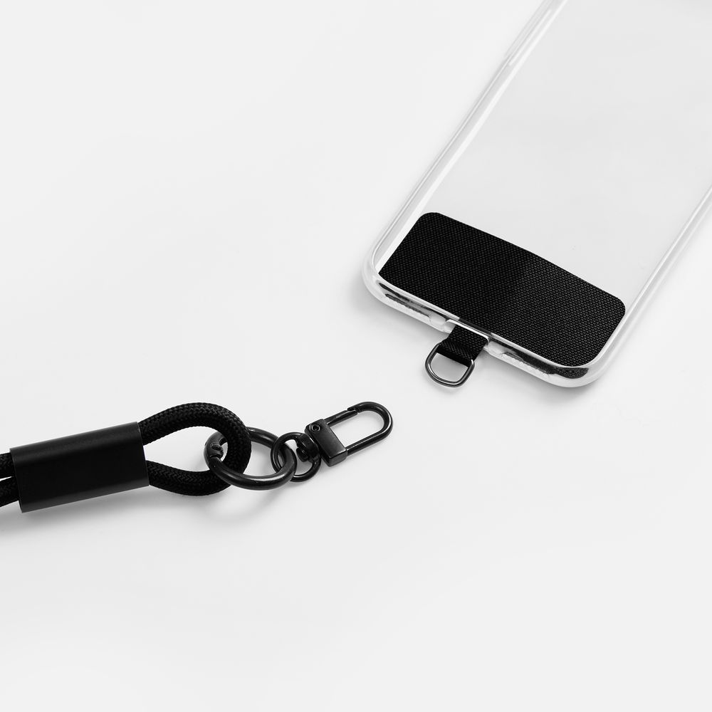 Важно: Для крепления кабеля телефон должен иметь чехол. Если ланьярд распускается под тяжестью смартфона, убедитесь, что среднее из трех колец фурнитуры находится по центру ланьярда (на шее под затылком), а не сбоку. Соседние ветви оплетки должны идти вместе, без зазоров, так достигается трение ткани о ткань.