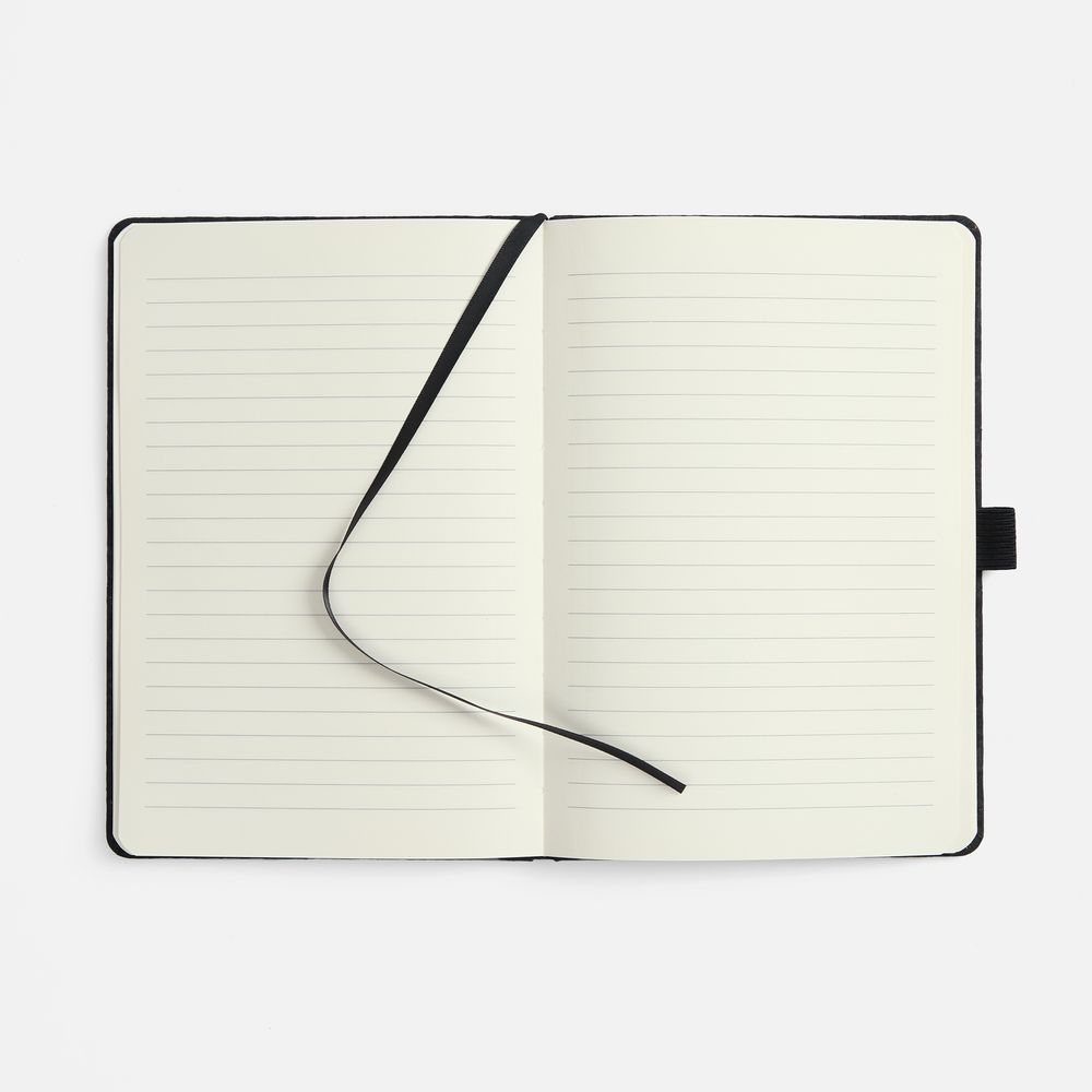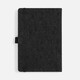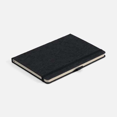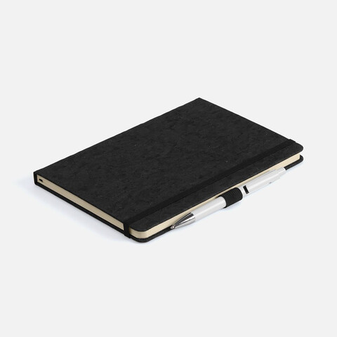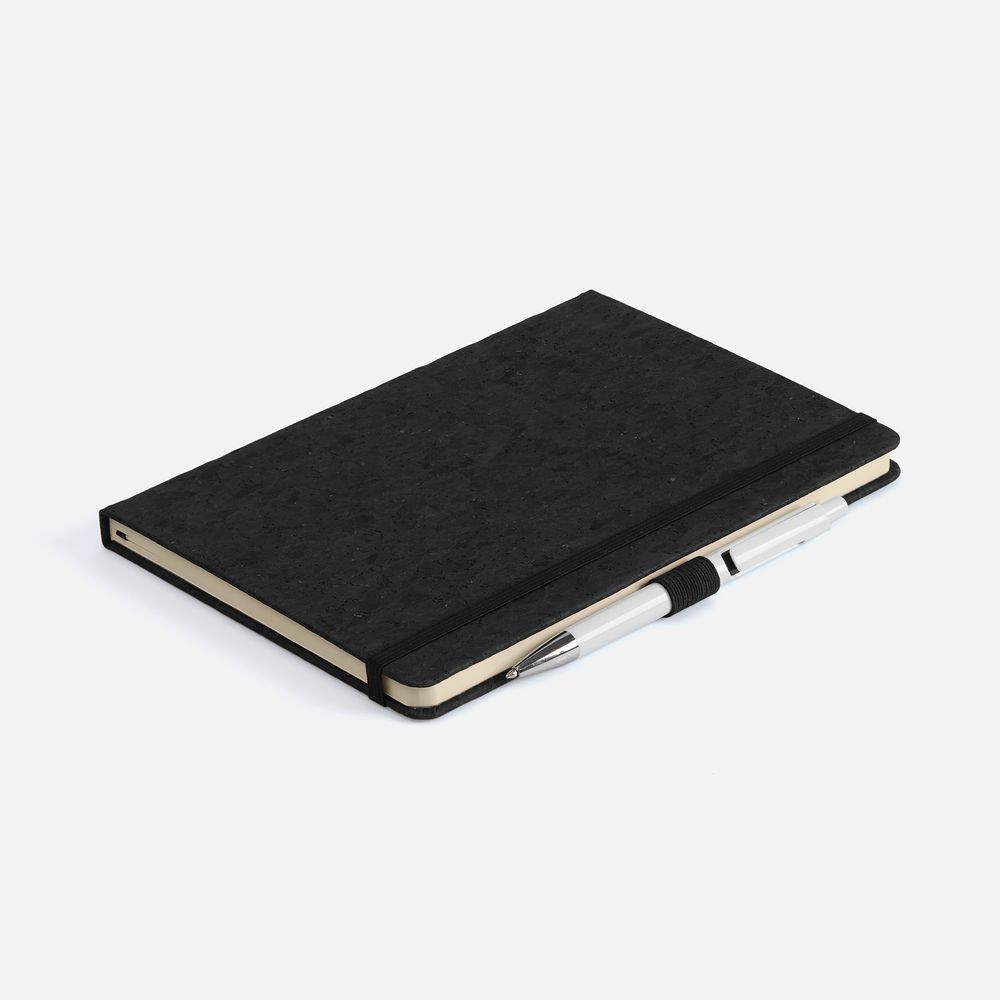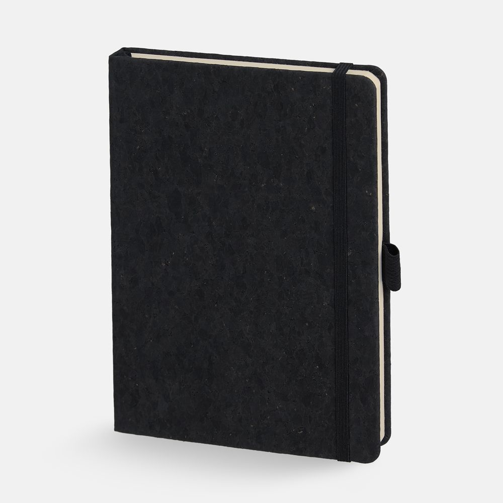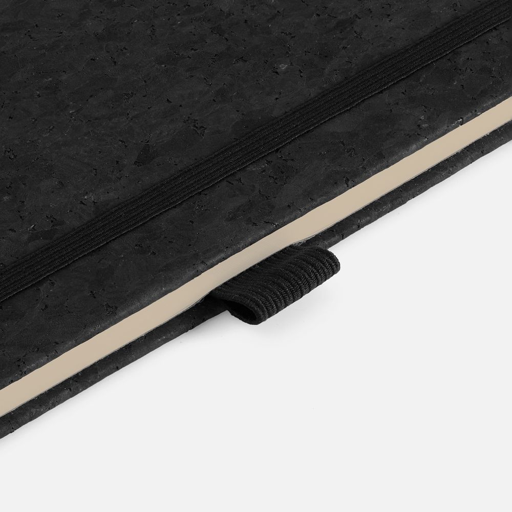 Блокнот с твердой обложкой из натуральной окрашенной пробки, дополнен петлей-резинкой для ручки, ляссе и резинкой в цвет обложки.