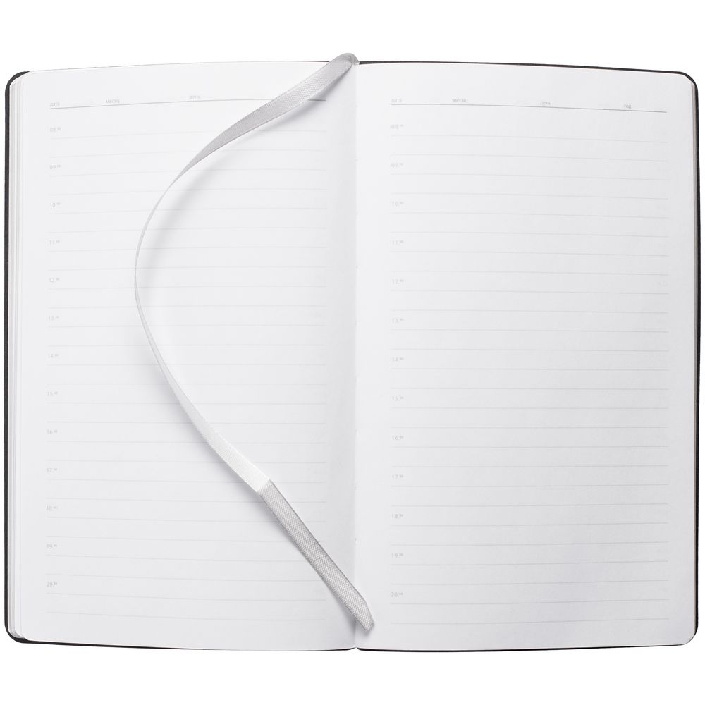 Ежедневник с гибкой обложкой и металлическим корешком, выполнен из материала Soft Touch, цвета морской волны II, дополнен серебристым обрезом блока и ляссе.