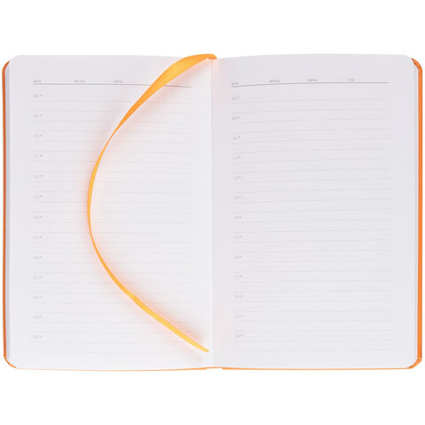 Ежедневник с твердой обложкой, выполнен из материала Latte, оранжевый ОО, дополнен ляссе в цвет обложки.