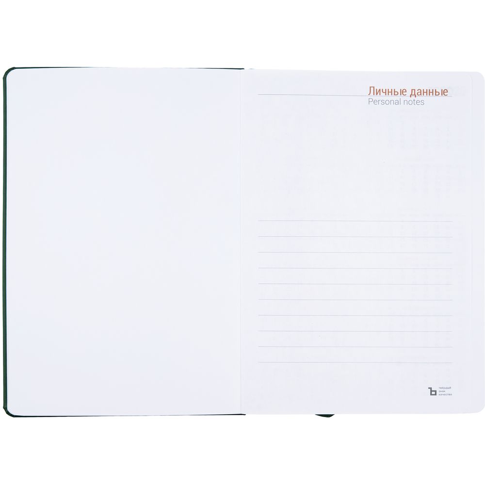 Ежедневник с твердой обложкой, выполнен из материала Latte, зеленый FF, дополнен ляссе в цвет обложки.