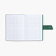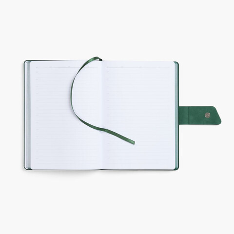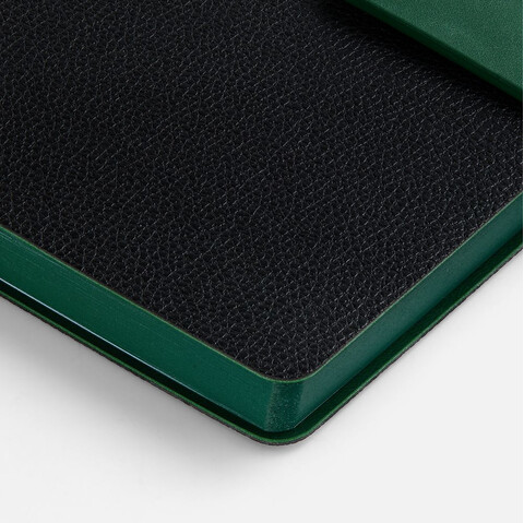 Ежедневник с гибкой обложкой, выполнен из материала La Fite, черный АА и NubuckTouch, зелёный, дополнен зеленым ляссе и хлястиком на кнопке.