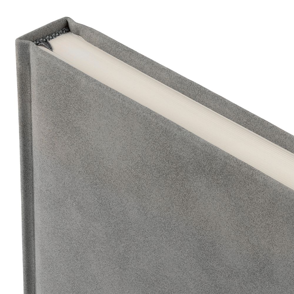 Ежедневник с твердой обложкой c поролоном, выполнен из материала Nubuck, серый СС, дополнен капталом и ляссе серого цвета. Застежка — хлястик на магните.