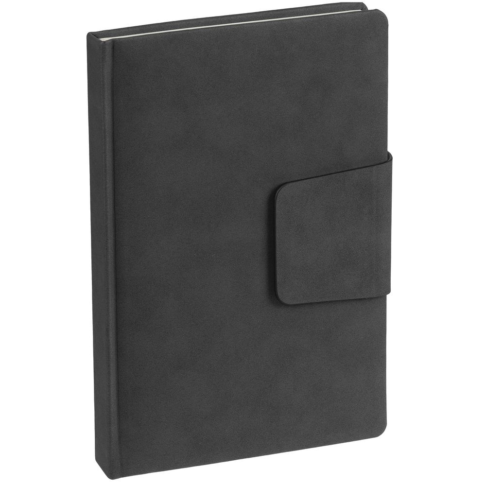 Ежедневник с твердой обложкой c поролоном, выполнен из материала Nubuck, темно-серый ЕЕ, дополнен капталом и ляссе черного цвета. Застежка — магнитный хлястик.
