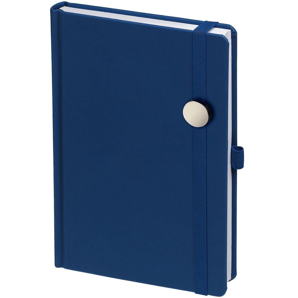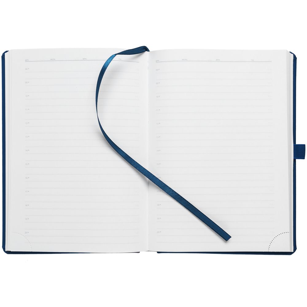 Ежедневник с твердой обложкой без поролона, выполнен из материала Soft Touch Ultra, синий НН, дополнен резинкой шириной 1 см, петлей-резинкой для ручки, капталом и ляссе синего цвета.