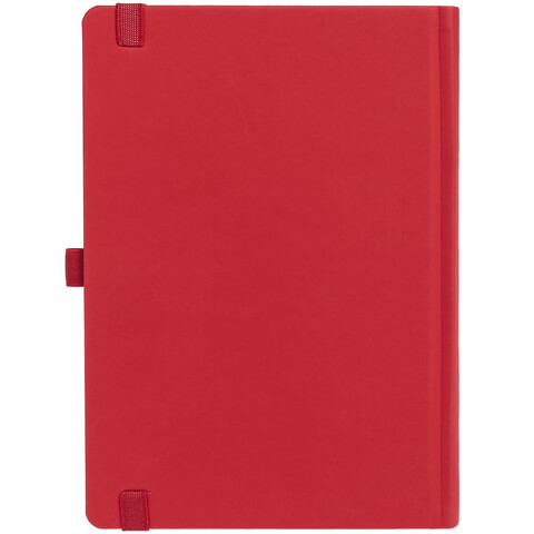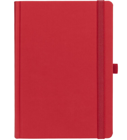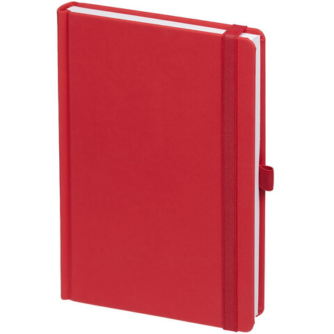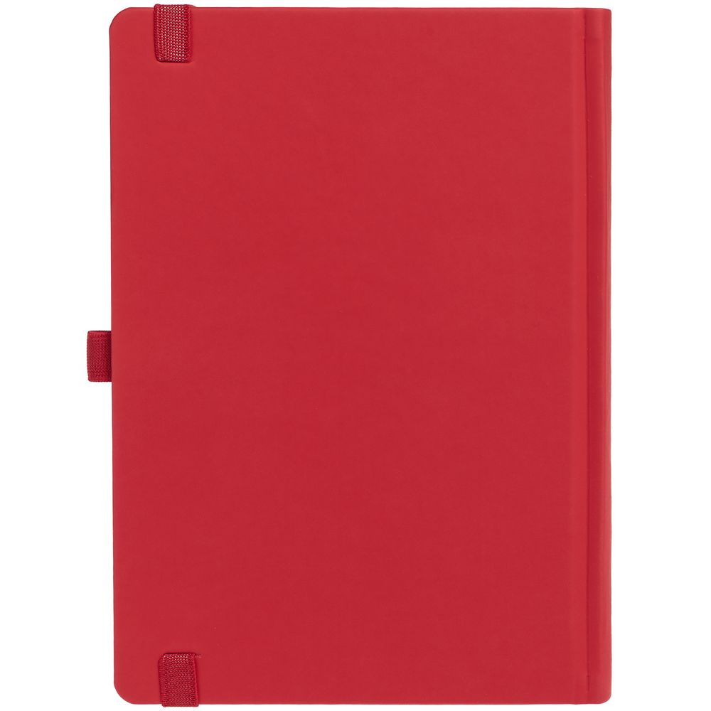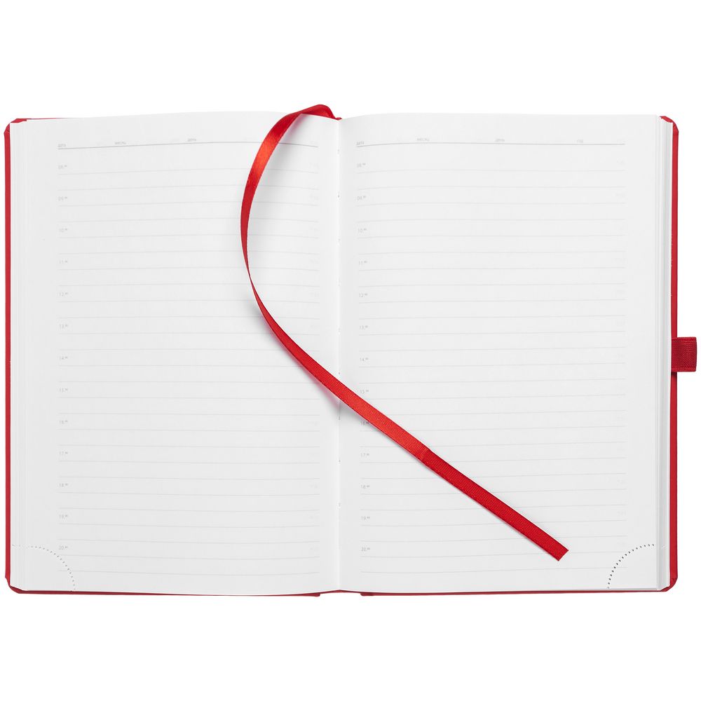 Ежедневник с твердой обложкой без поролона, выполнен из материала Soft Touch Ultra, красный РР, дополнен резинкой шириной 1 см, петлей-резинкой для ручки, капталом и ляссе красного цвета.