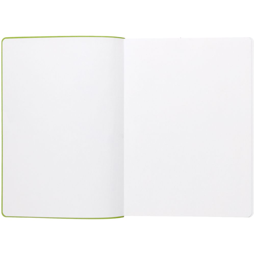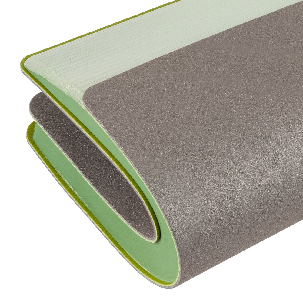 Гибкая обложка выполнена из материала Velour Melange, серый СС и Latte, светло-зеленый (внутренняя часть обложки). Внутри корешка — специальное место для крепления ручки размером до 15х0,9 см.