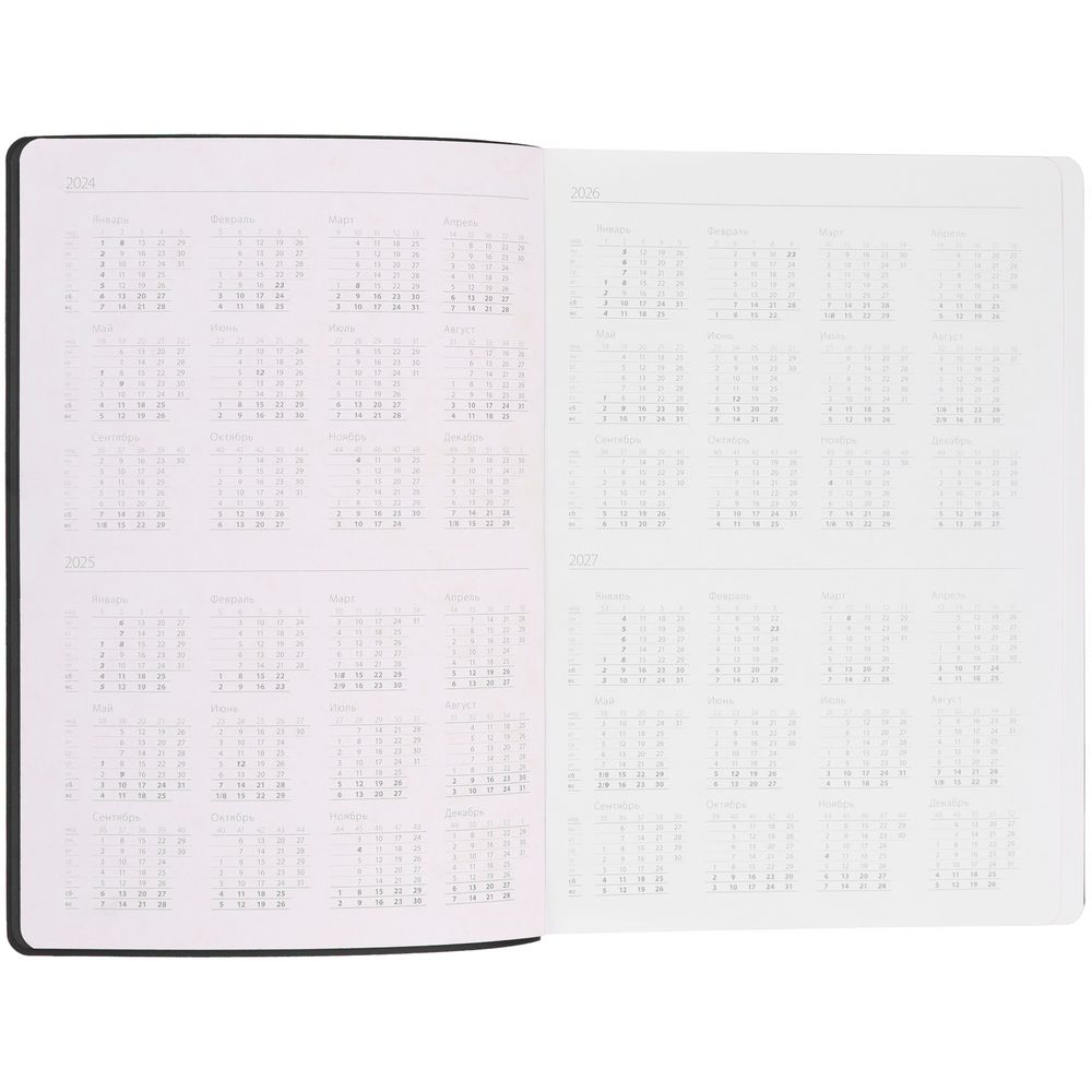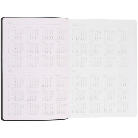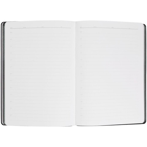 Гибкая обложка выполнена из материала Soft Touch, черный АА и Latte, черный АА (внутренняя часть обложки). Внутри корешка — специальное место для крепления ручки размером до 15х1 см.