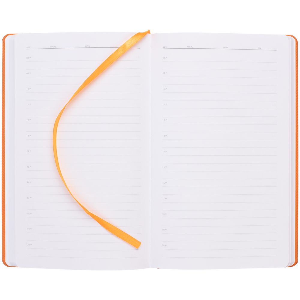Ежедневник с твердой обложкой, выполнен из материала Canyon, оранжевый ОО, дополнен ляссе в цвет обложки.