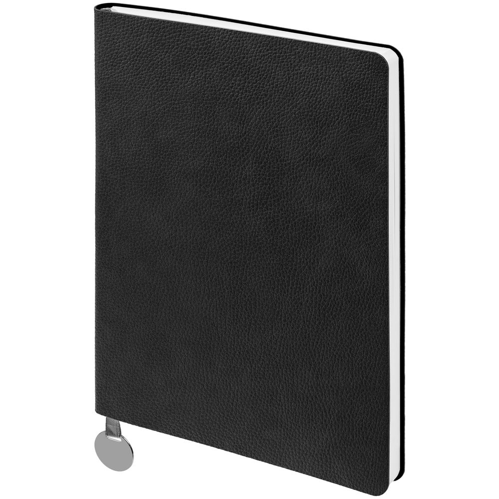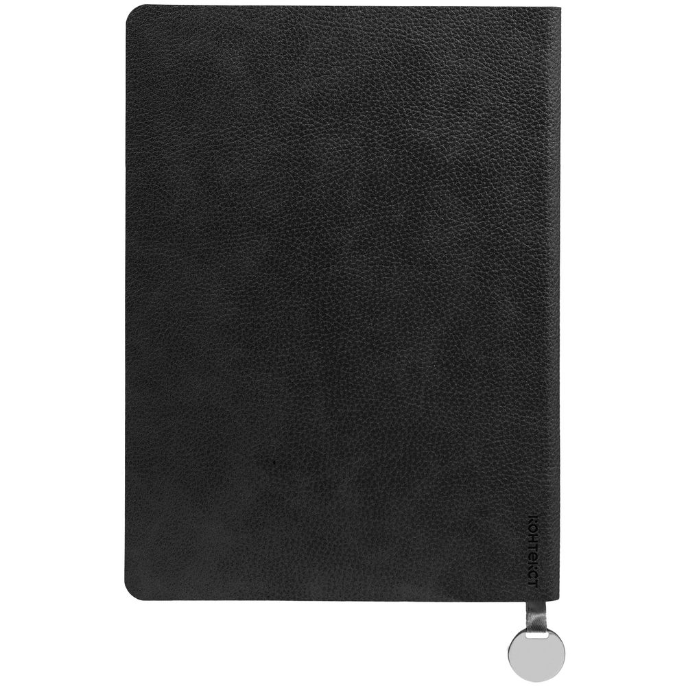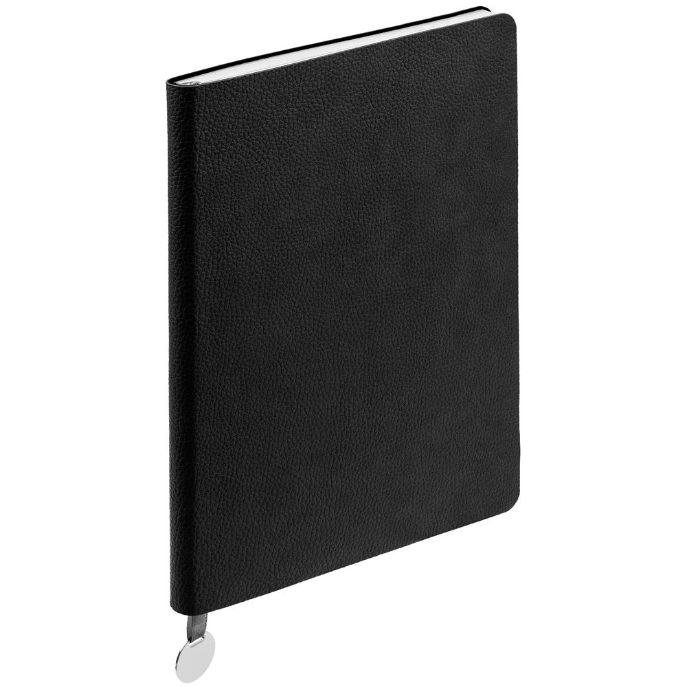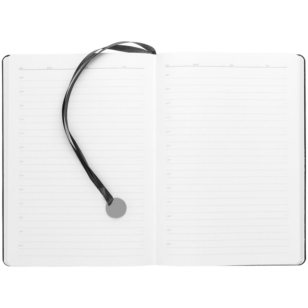 Ежедневник с гибкой обложкой, выполнен из материала La Fite, черный АА, дополнен ляссе в цвет обложки с металлическим шильдом.