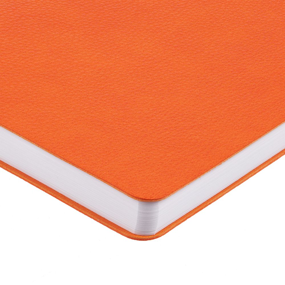 Ежедневник с гибкой обложкой, выполнен из материал La Fite, оранжевый ОО, дополнен ляссе в цвет обложки с металлическим шильдом.