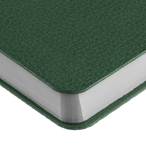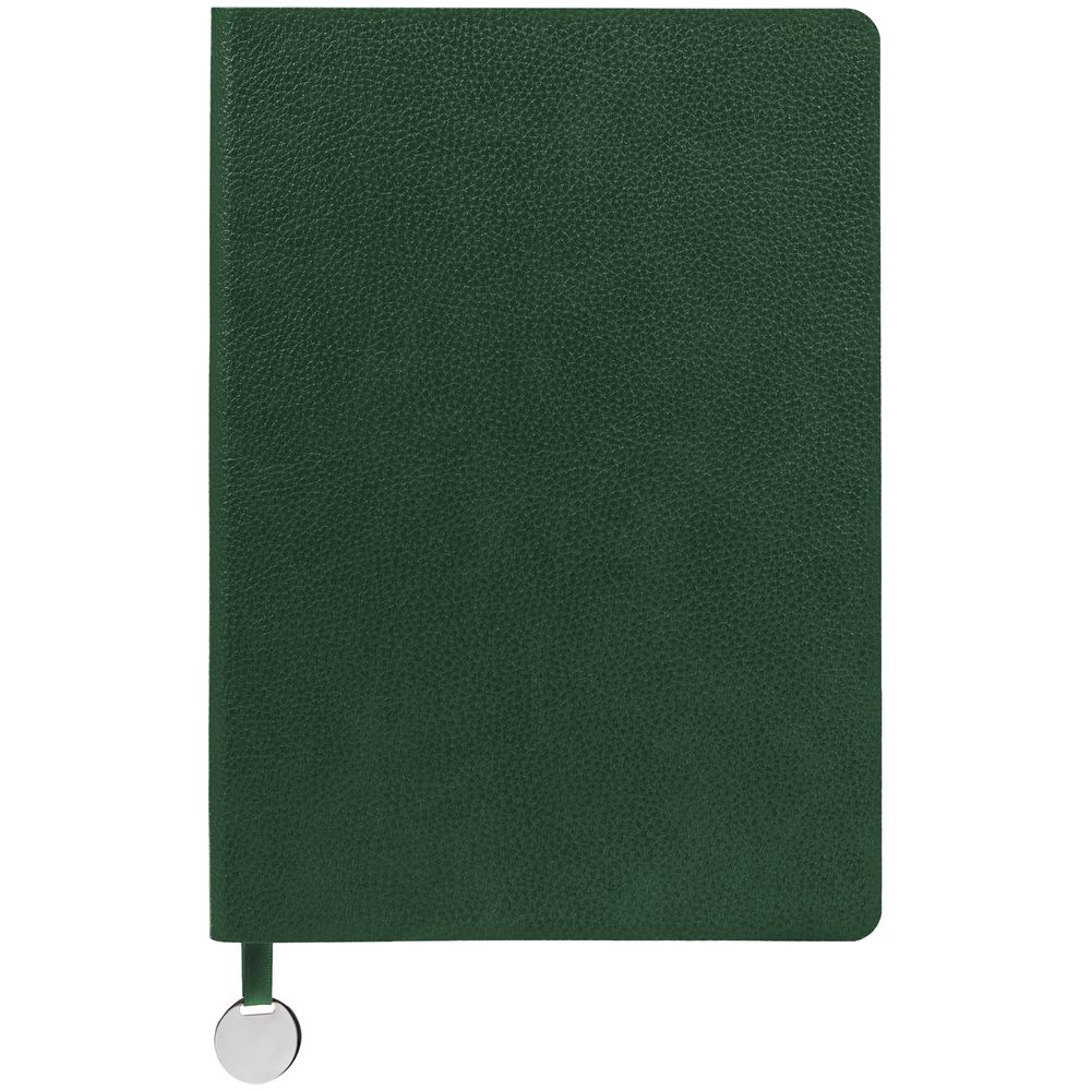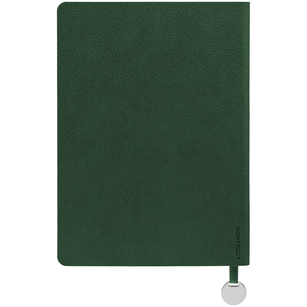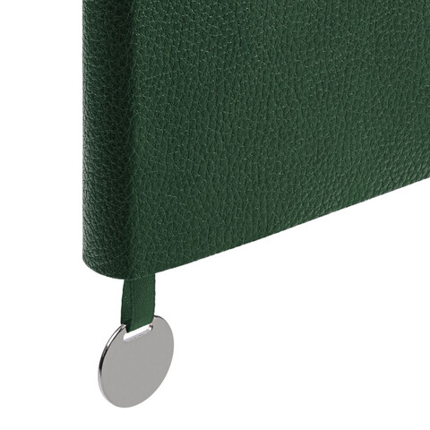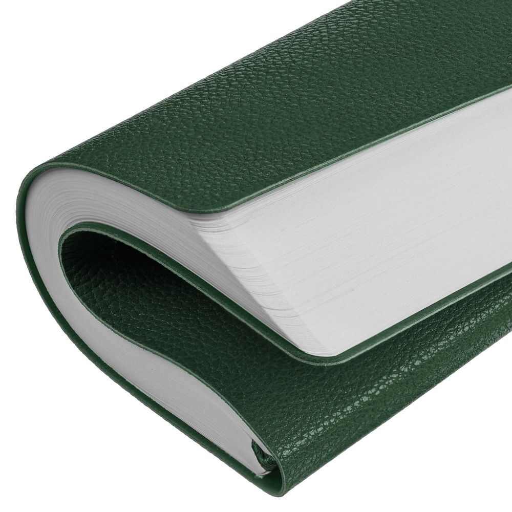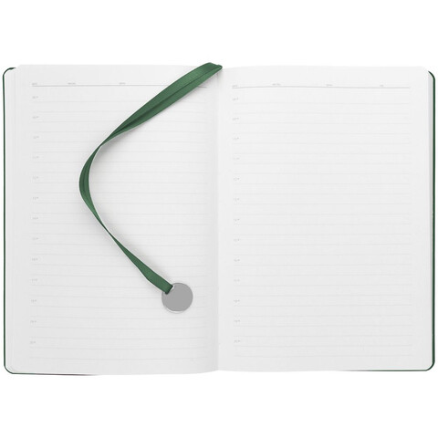 Ежедневник с гибкой обложкой, выполнен из материала La Fite, зеленый, дополнен ляссе в цвет обложки с металлическим шильдом.