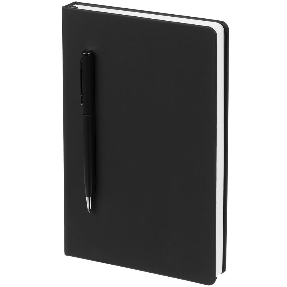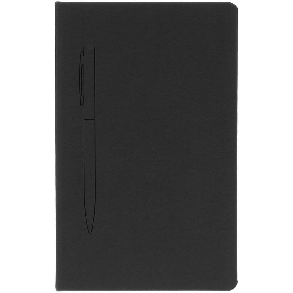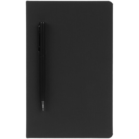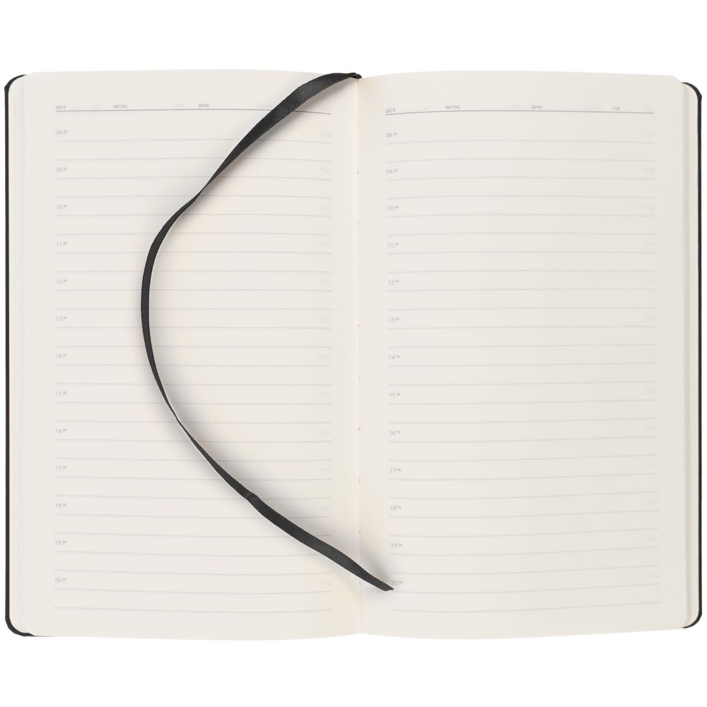 Ежедневник в твердой обложке, выполненной из материала Soft Touch Pearl, черный АА, дополнен цветным ляссе и магнитом, удерживающим ручку.