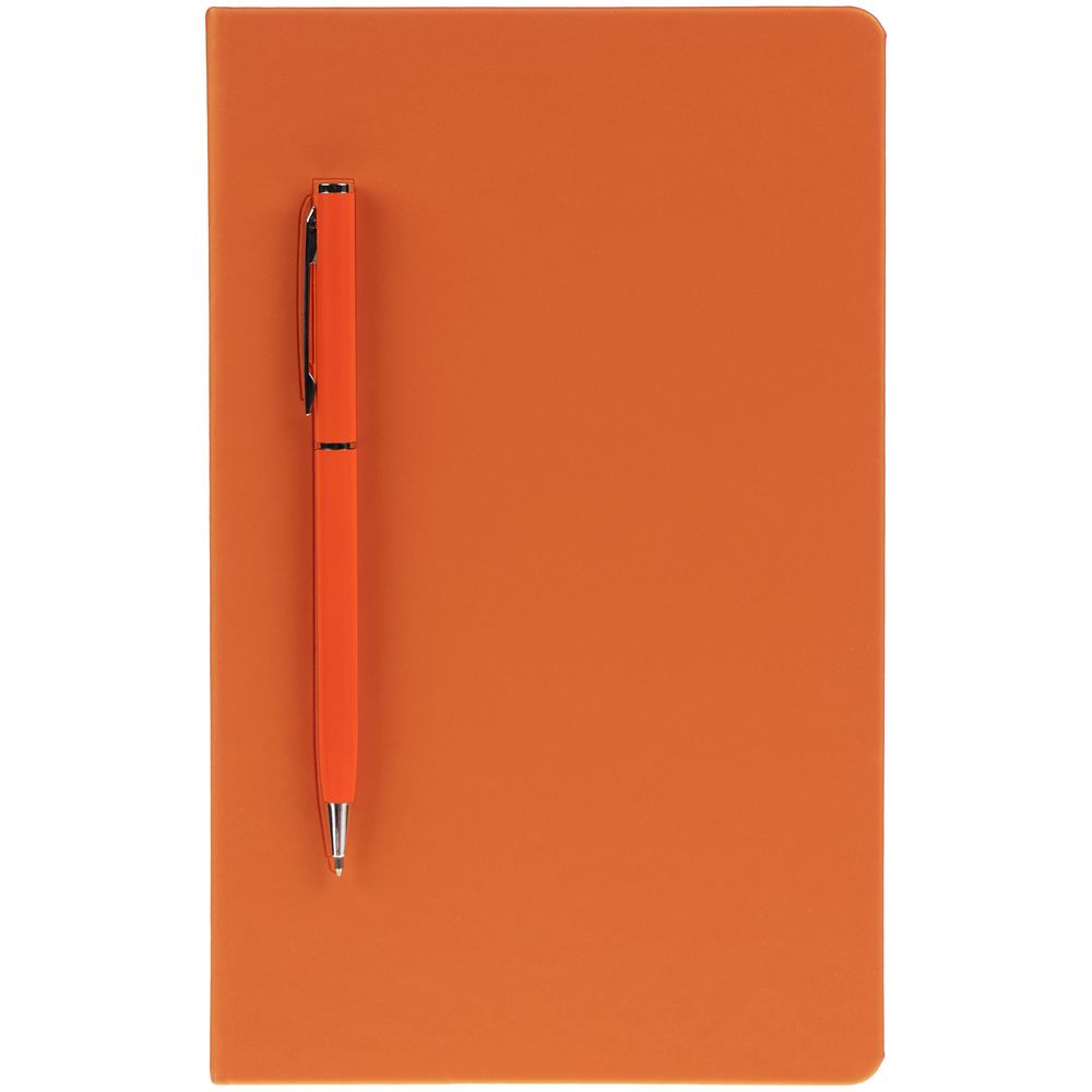 Ежедневник в твердой обложке, выполненной из материала Soft Touch Pearl, оранжевый ОО, дополнен цветным ляссе и магнитом, удерживающим ручку.