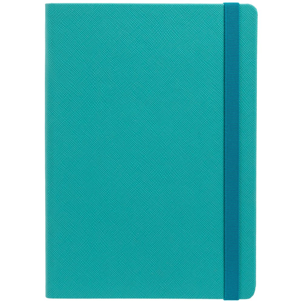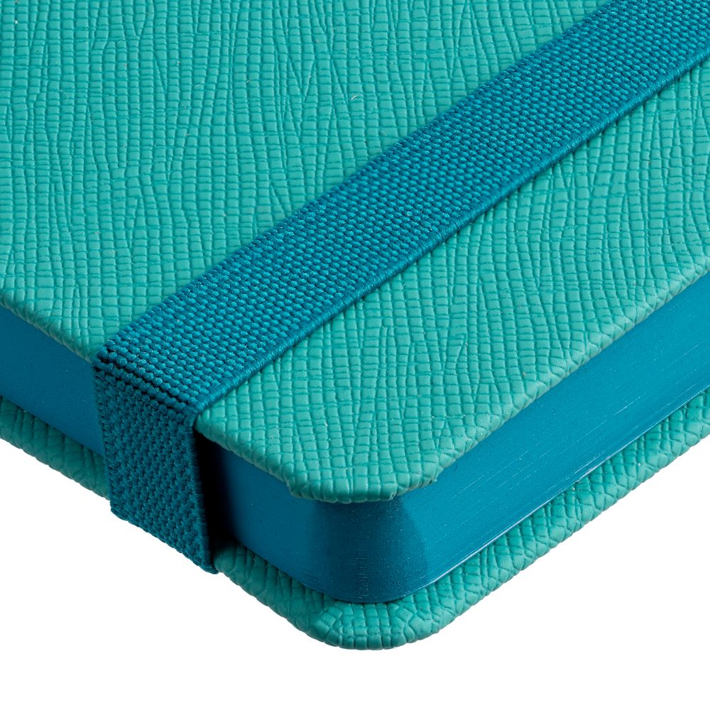 Ежедневник с твердой обложкой выполнен из материала Nice Touch, морская волна II, и дополнен резинкой шириной 1 см и ляссе в цвет обложки.