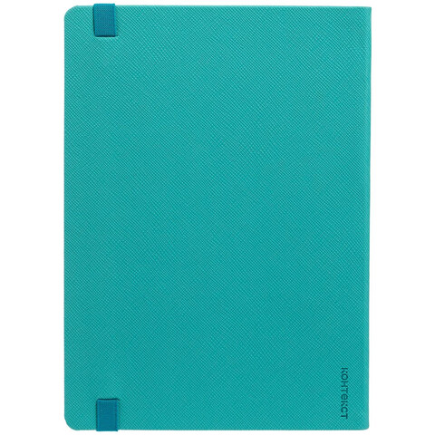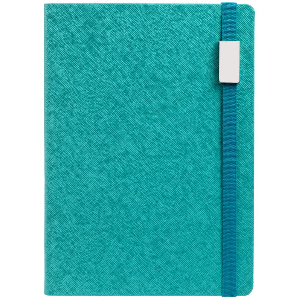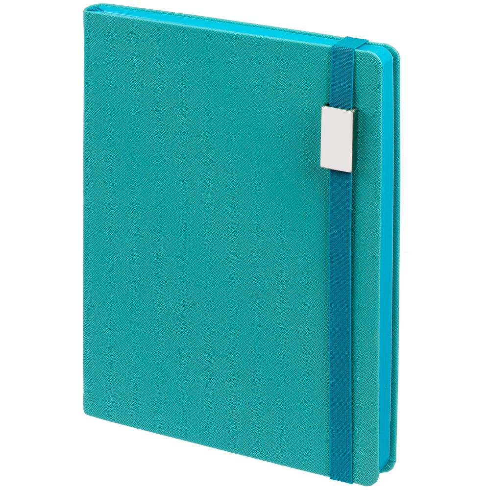Ежедневник с полутвердой обложкой выполнен из материала Nice Touch, морская волна II, и дополнен резинкой шириной 1 см с металлическим шильдом и ляссе в цвет обложки.