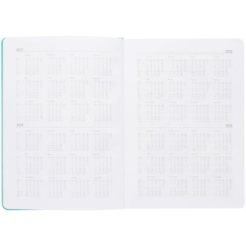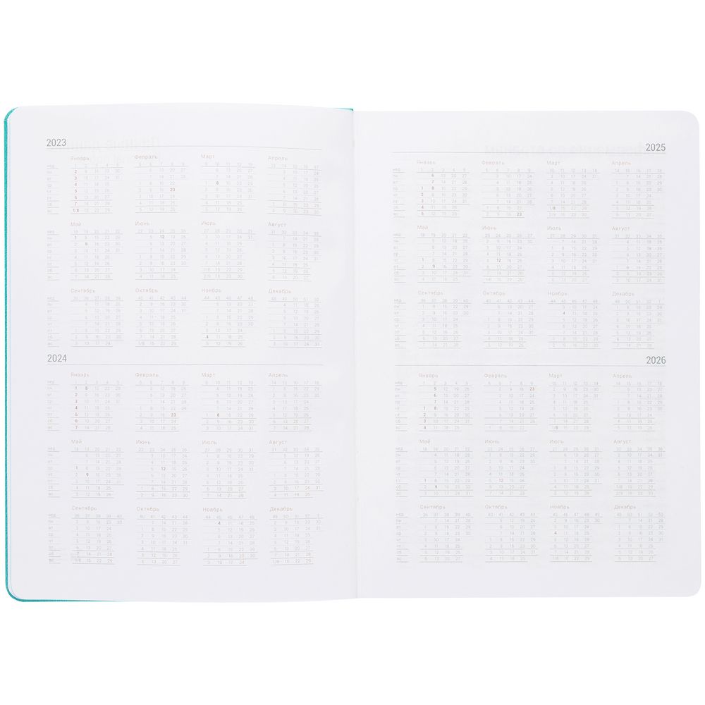 Ежедневник с твердой обложкой, выполнен из материала Latte, цвет морской волны II, обрез бирюзового цвета, дополнен ляссе бирюзового цвета и резинкой с металлическим шильдом.