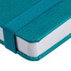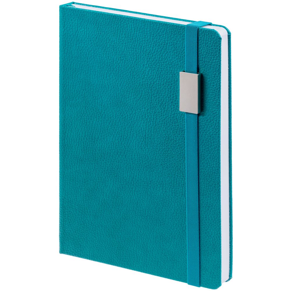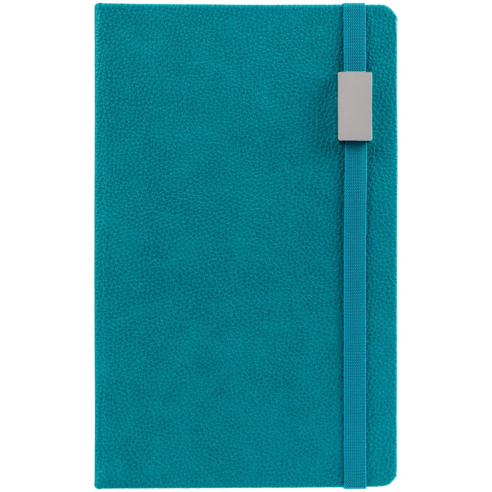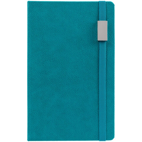 Ежедневник с твердой обложкой, выполнен из материала LaFite, цвет морской волны II, дополнен резинкой с металлическим прямоугольным шильдом и ляссе в цвет обложки.