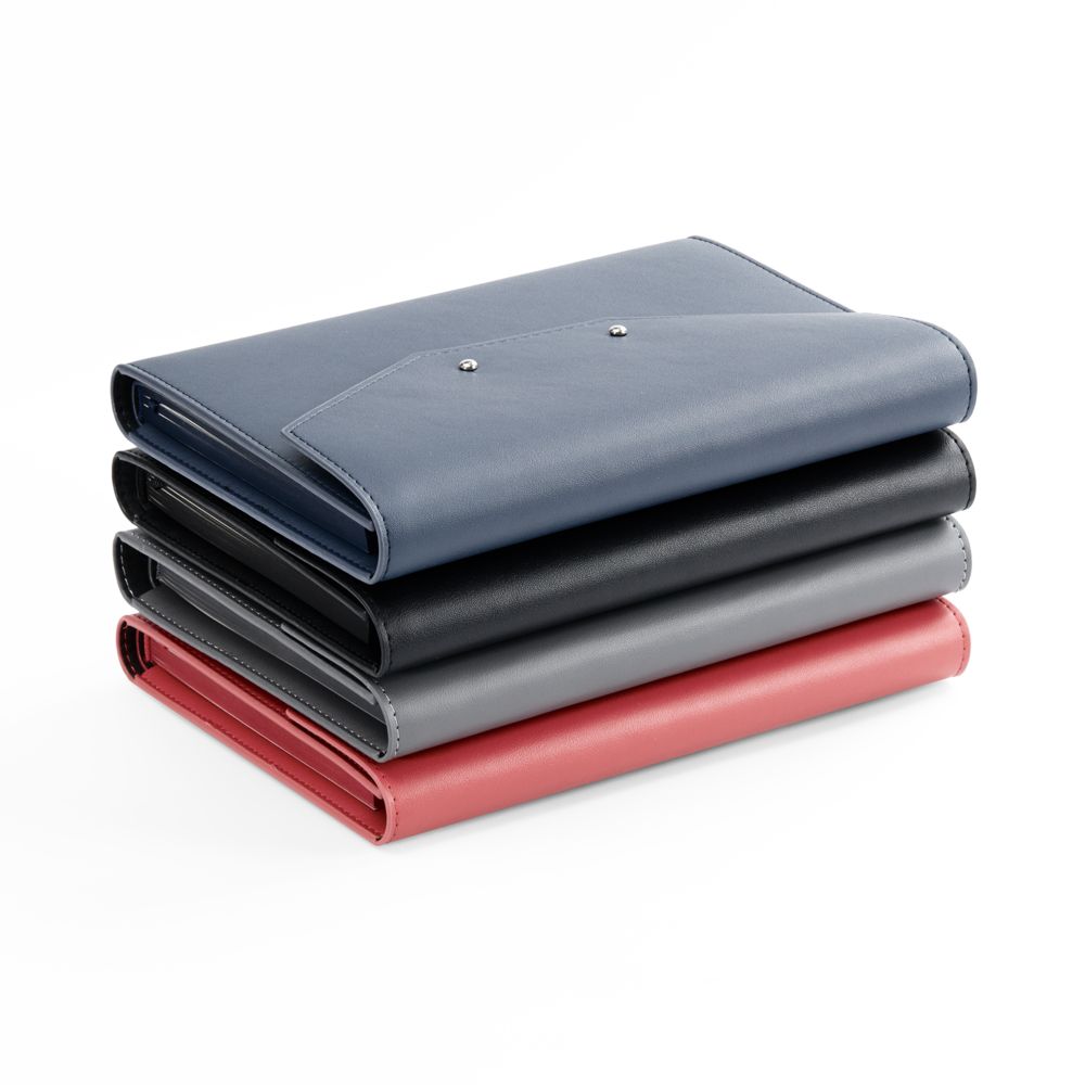 Ежедневник-органайзер в мягком переплете, формат А5+, с карманами для визиток и документов, петлей для ручки. Дополнен ляссе и капталом в цвет обложки. Клапан с прорезями застегивается на "кобурные металлические кнопки".