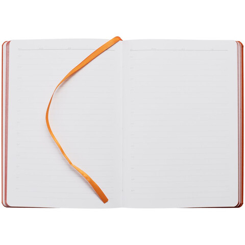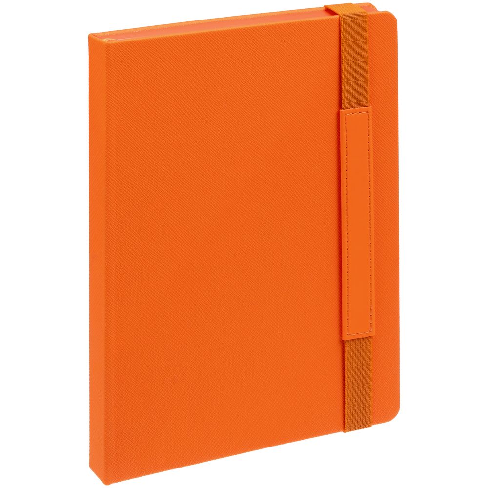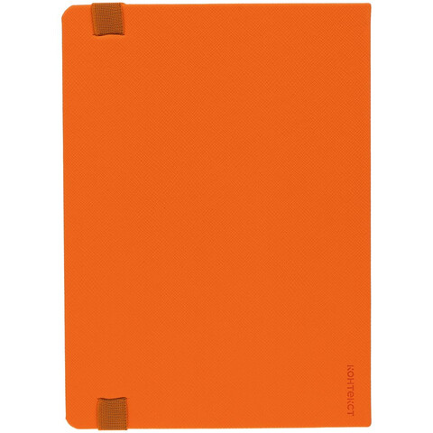 Ежедневник с твердой обложкой, выполнен из материала Nice Touch, оранжевый ОО, дополнен резинкой с лейблом из материала Soft Touch и ляссе в цвет обложки.