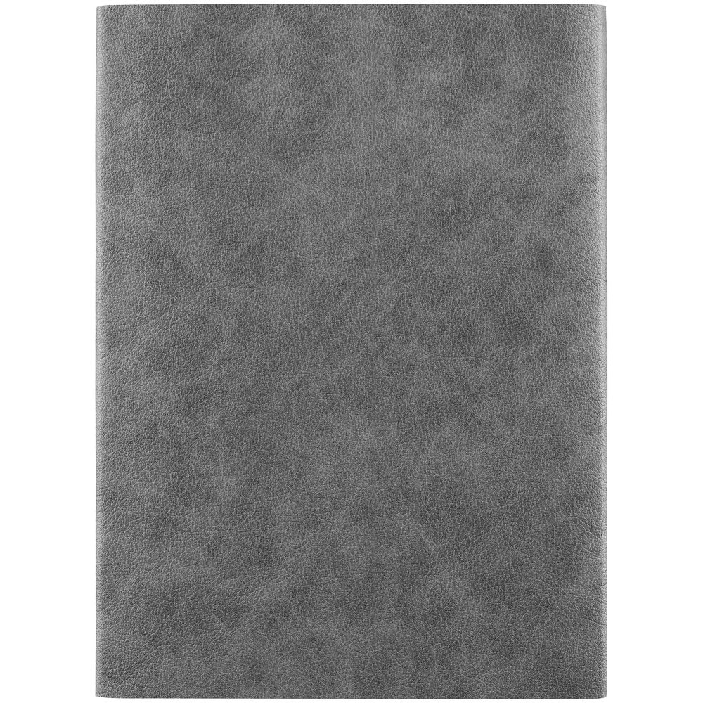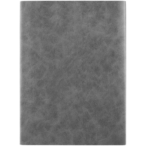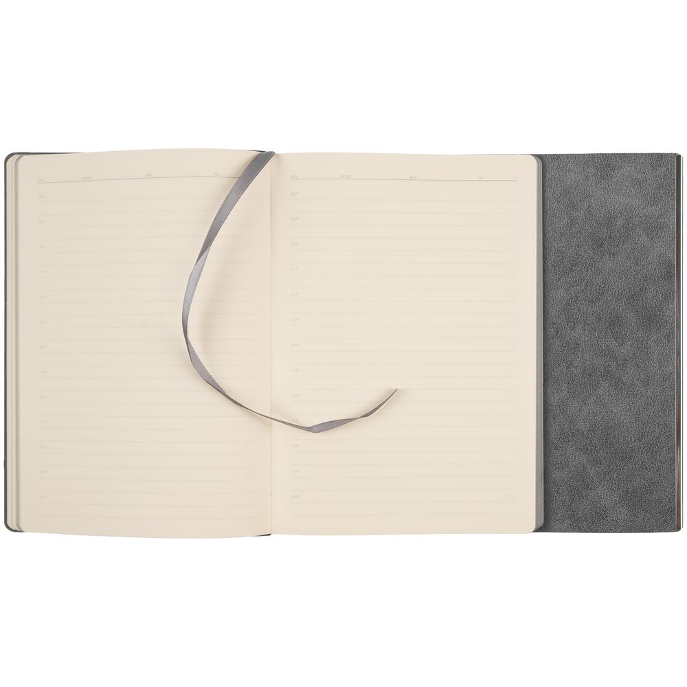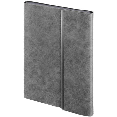Ежедневник с гибкой обложкой, клапаном на магните и металлической отделкой клапана. Выполнен из материала Petrus, серый СС, дополнен серым ляссе.