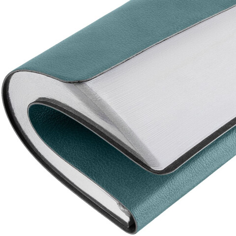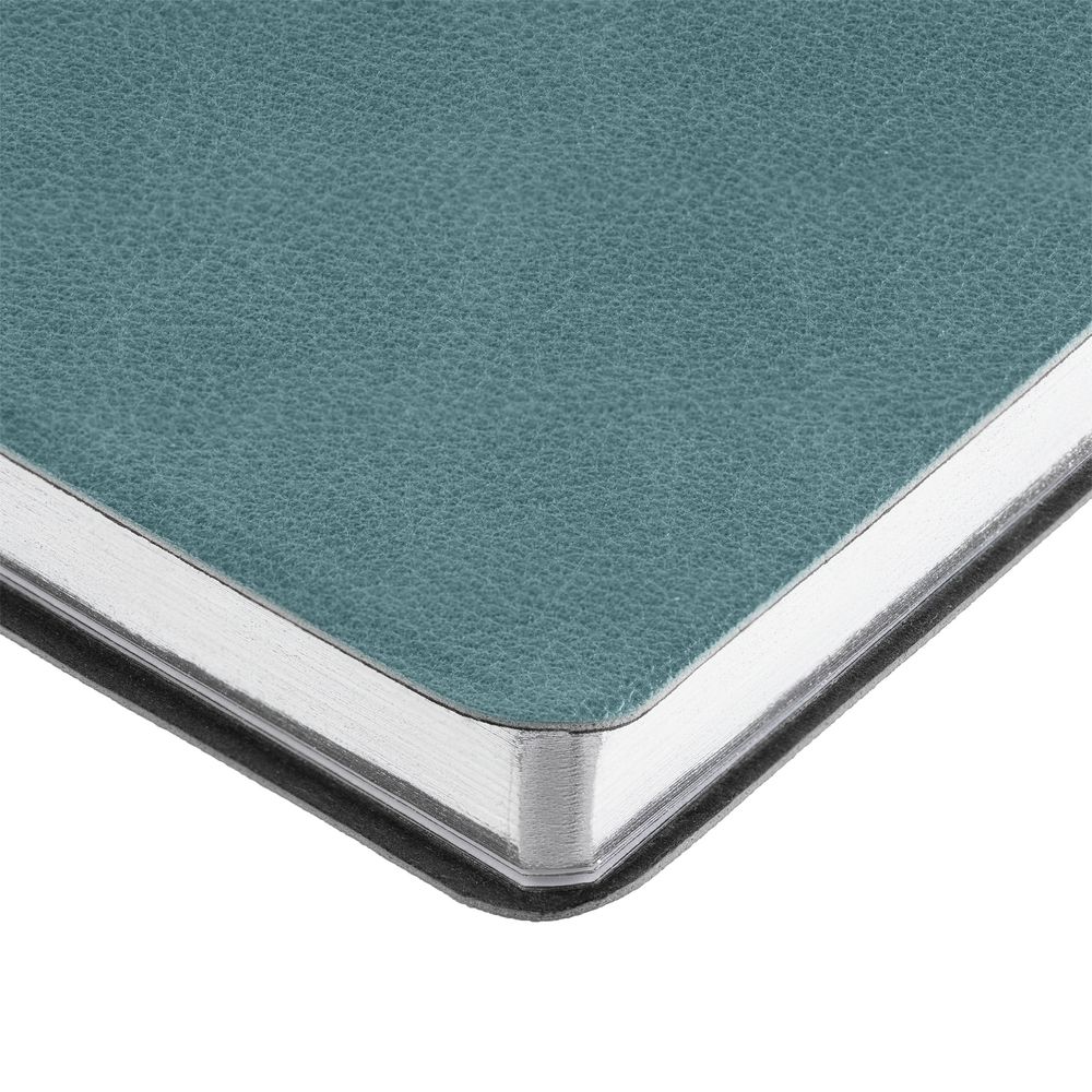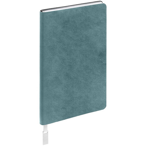 Ежедневник с гибкой обложкой, выполнен из материала Petrus, голубой JJ, дополнен серым ляссе с металлическим шильдиком.