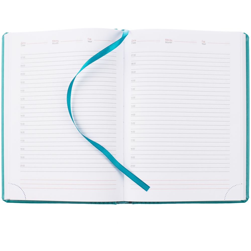 Ежедневник с твердой обложкой, выполнен из материала Waltz, морская волна II, дополнен ляссе в цвет материала.