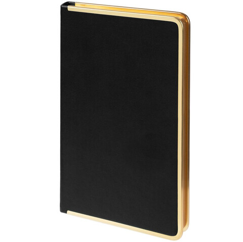 Изящный ежедневник с зауженным блоком и стильными деталями — металлической окантовкой на обложке и металлизированным обрезом.