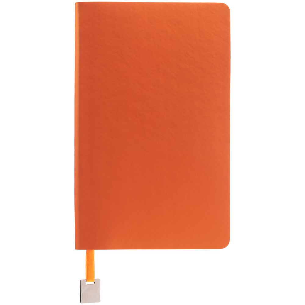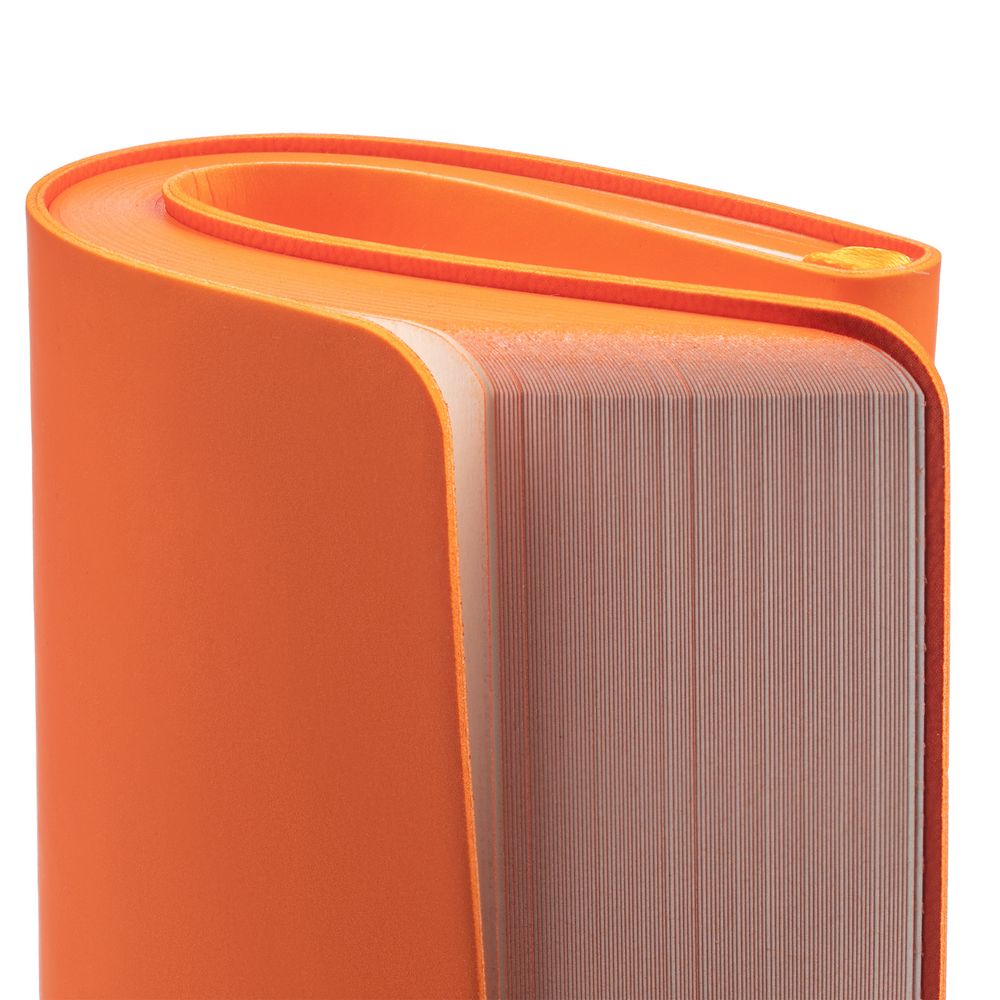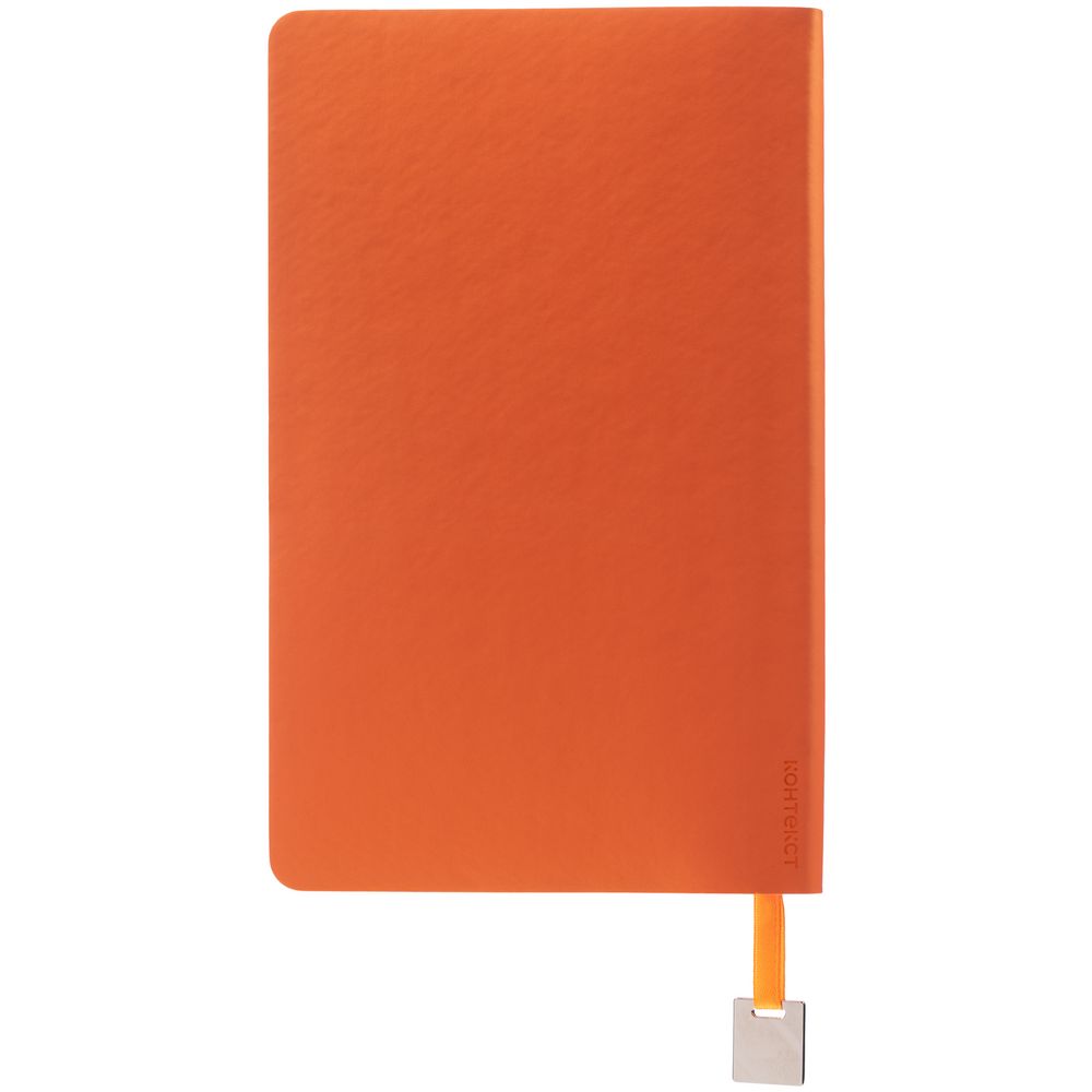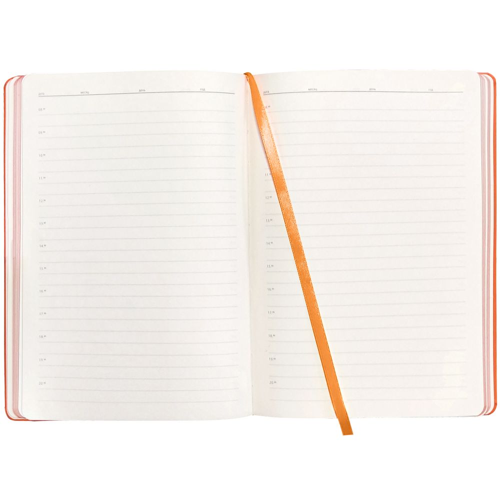 Ежедневник с гибкой обложкой, выполнен из материалов Soft Touch Pearl, оранжевый ОО, и Latte, оранжевый (внутренняя часть обложки), дополнен ляссе в цвет обложки с металлическим шильдиком.