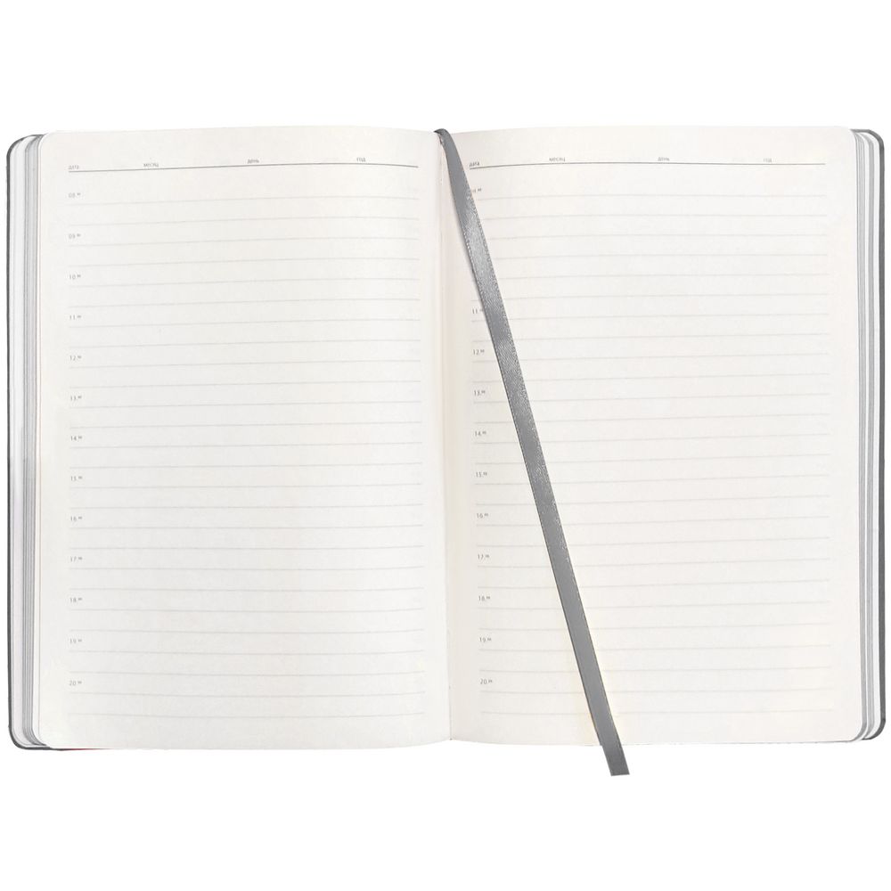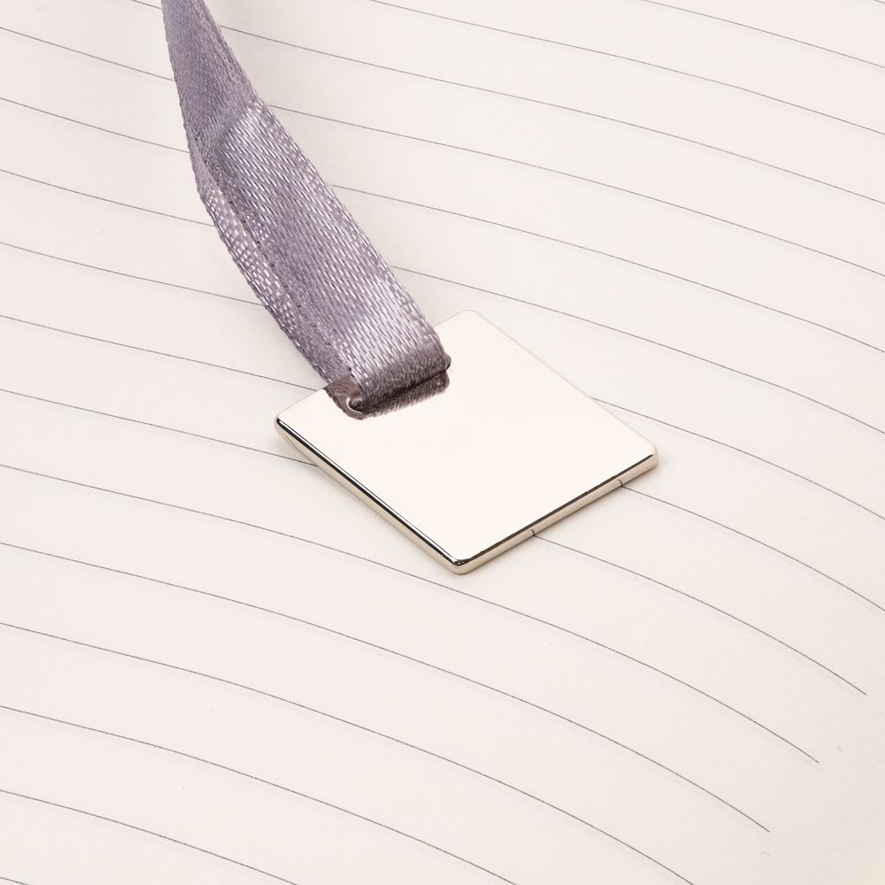 Ежедневник с гибкой обложкой, выполнен из материалов Soft Touch Pearl, серый СС, и Latte, серый (внутренняя часть обложки), дополнен ляссе в цвет обложки с металлическим шильдиком.