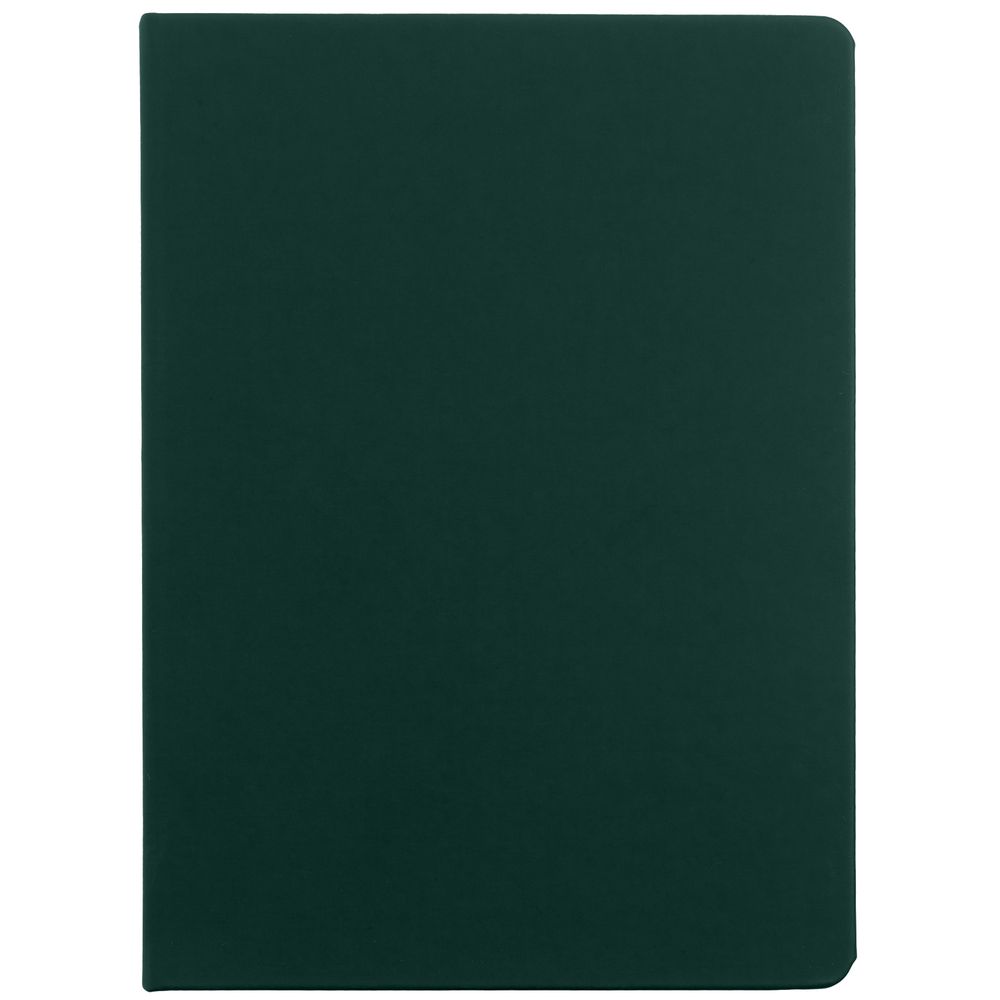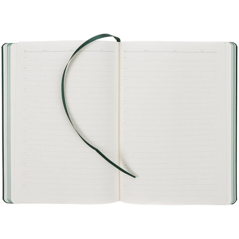 Ежедневник с твердой обложкой и тонированным обрезом, выполнен из материала Soft Touch, зеленый FF, дополнен ляссе в цвет обложки.