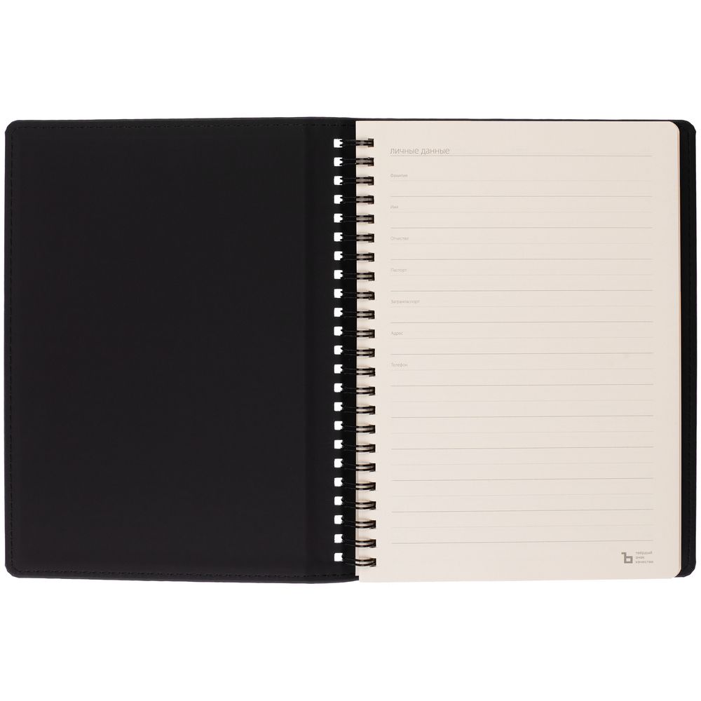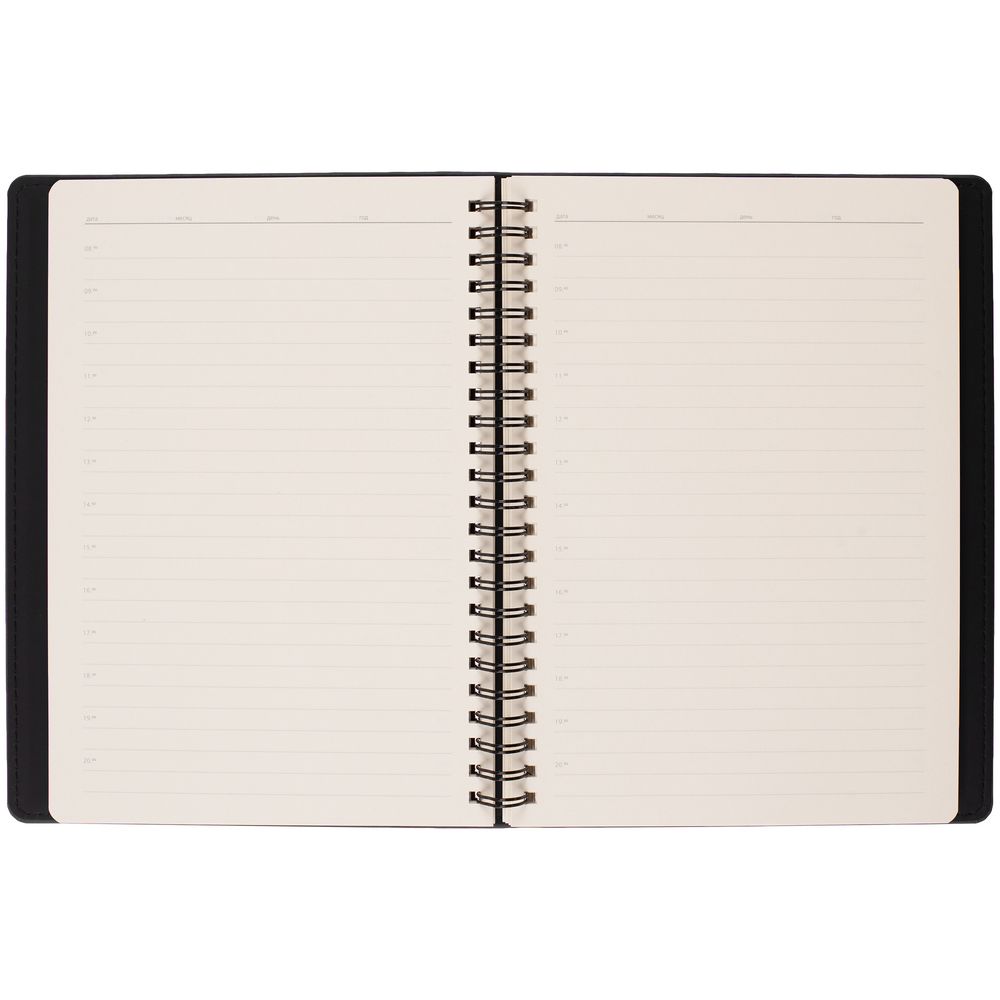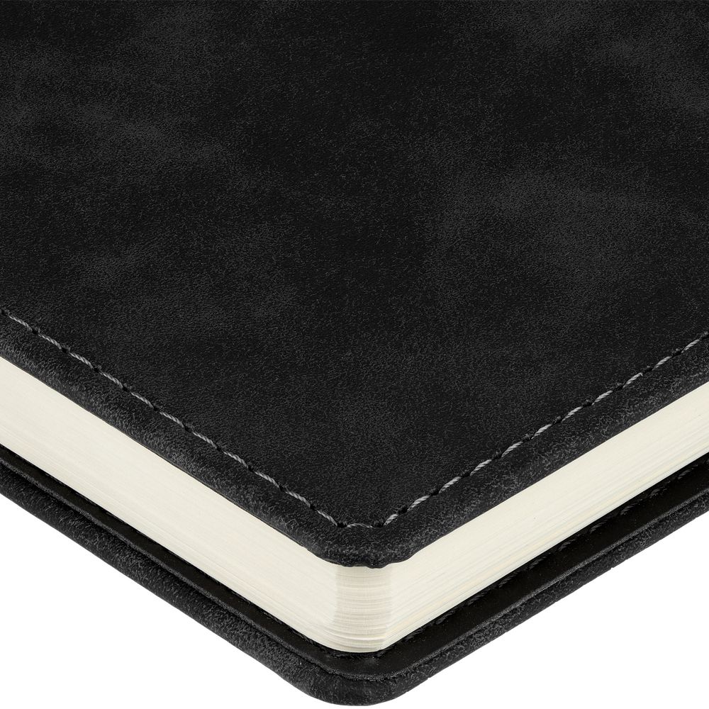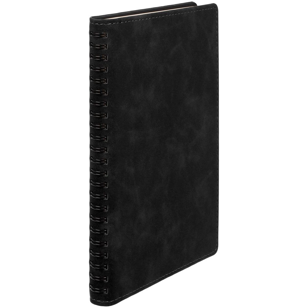 Ежедневник с блоком на пружине в твердой обложке, выполнен из материалов Nubuk Touch, черный AA и Soft Touch, черный AA.