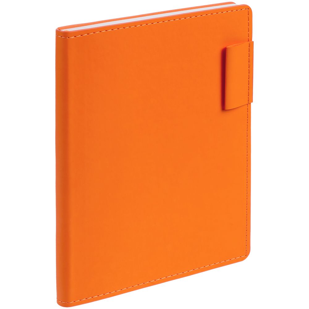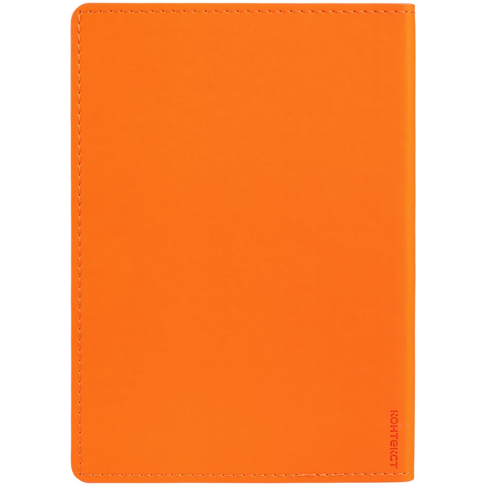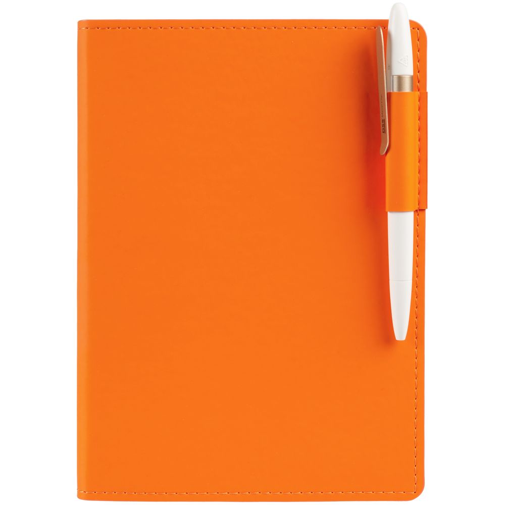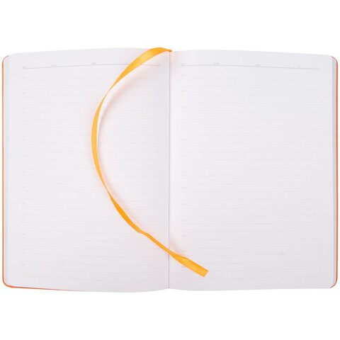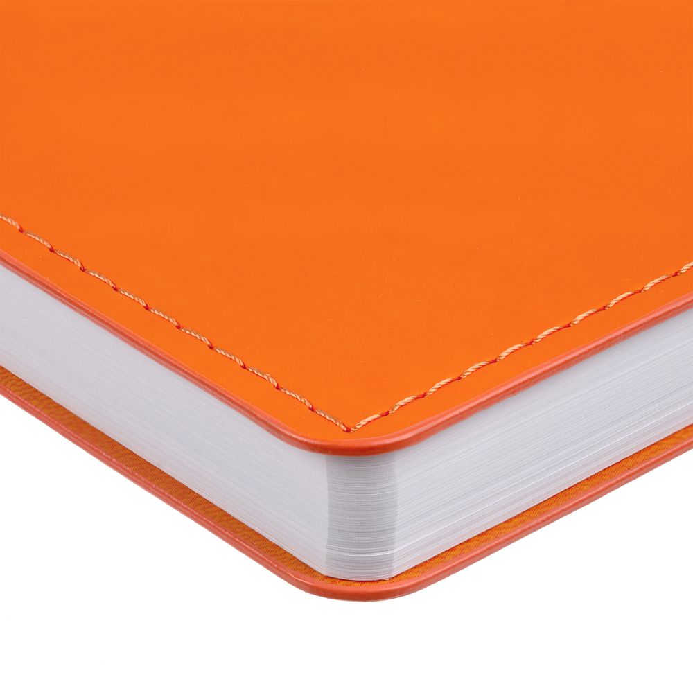 Ежедневник с гибкой обложкой из материала Soft Touch, оранжевый ОО и Latte, оранжевый ОО (внутренний материал), дополнен петелькой для ручки из покровного материала, капталом, ляссе и закрашенным срезом обложки в цвет материала.