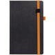 Ежедневник с полутвердой обложкой, выполнен из материала Waltz, черный АА, дополнен оранжевой резинкой с металлическим шильдом и ляссе.