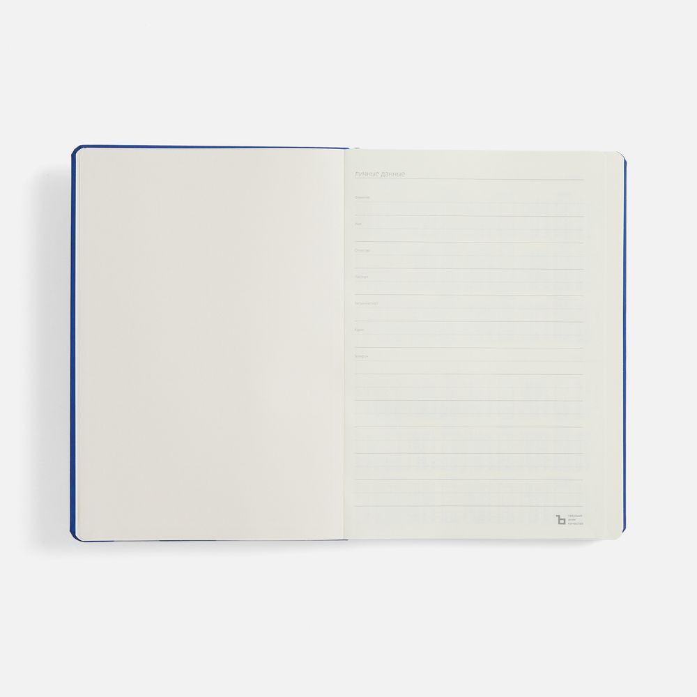 Ежедневник с твердой обложкой, выполнен из материала Nubuck Touch, синий НН, дополнен ляссе темно-синего цвета.
