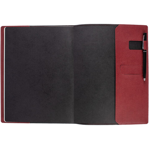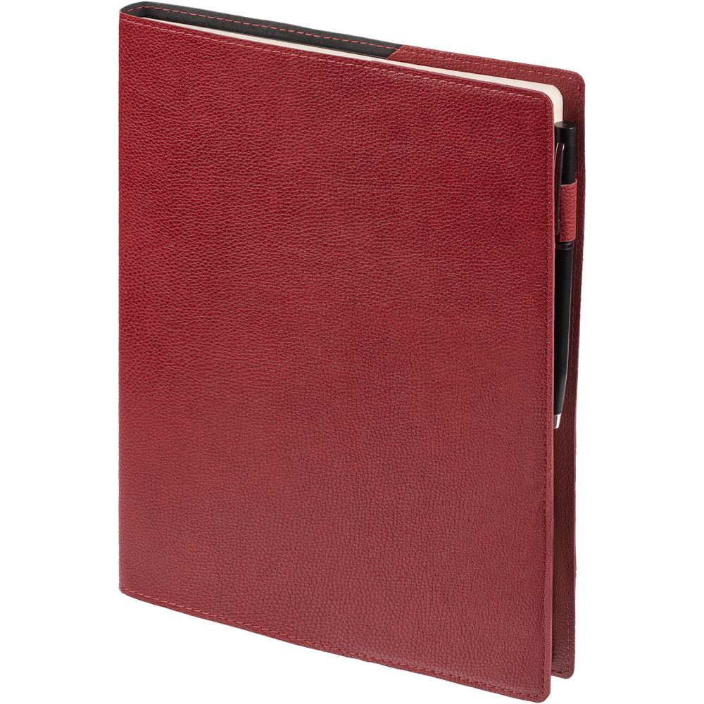 Ежедневник в суперобложке выполнен из материала La Fite, красный РР, дополнен ляссе и капталом черного цвета.