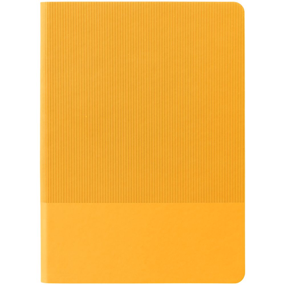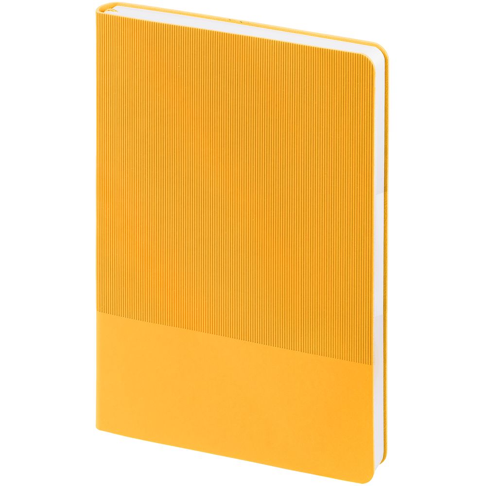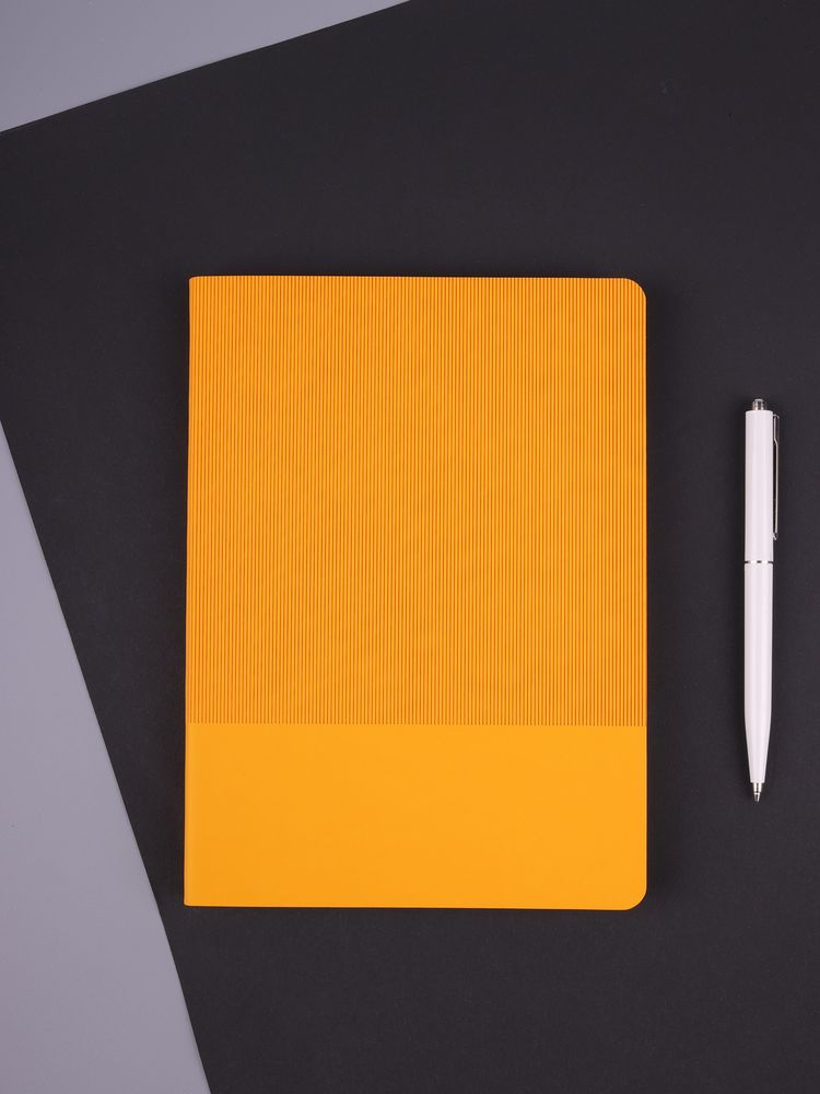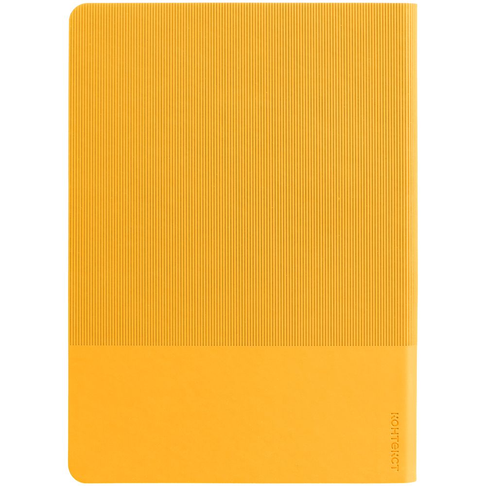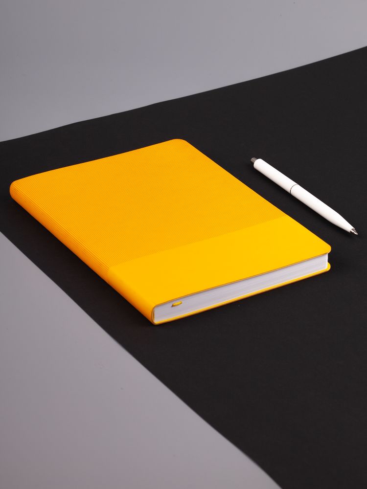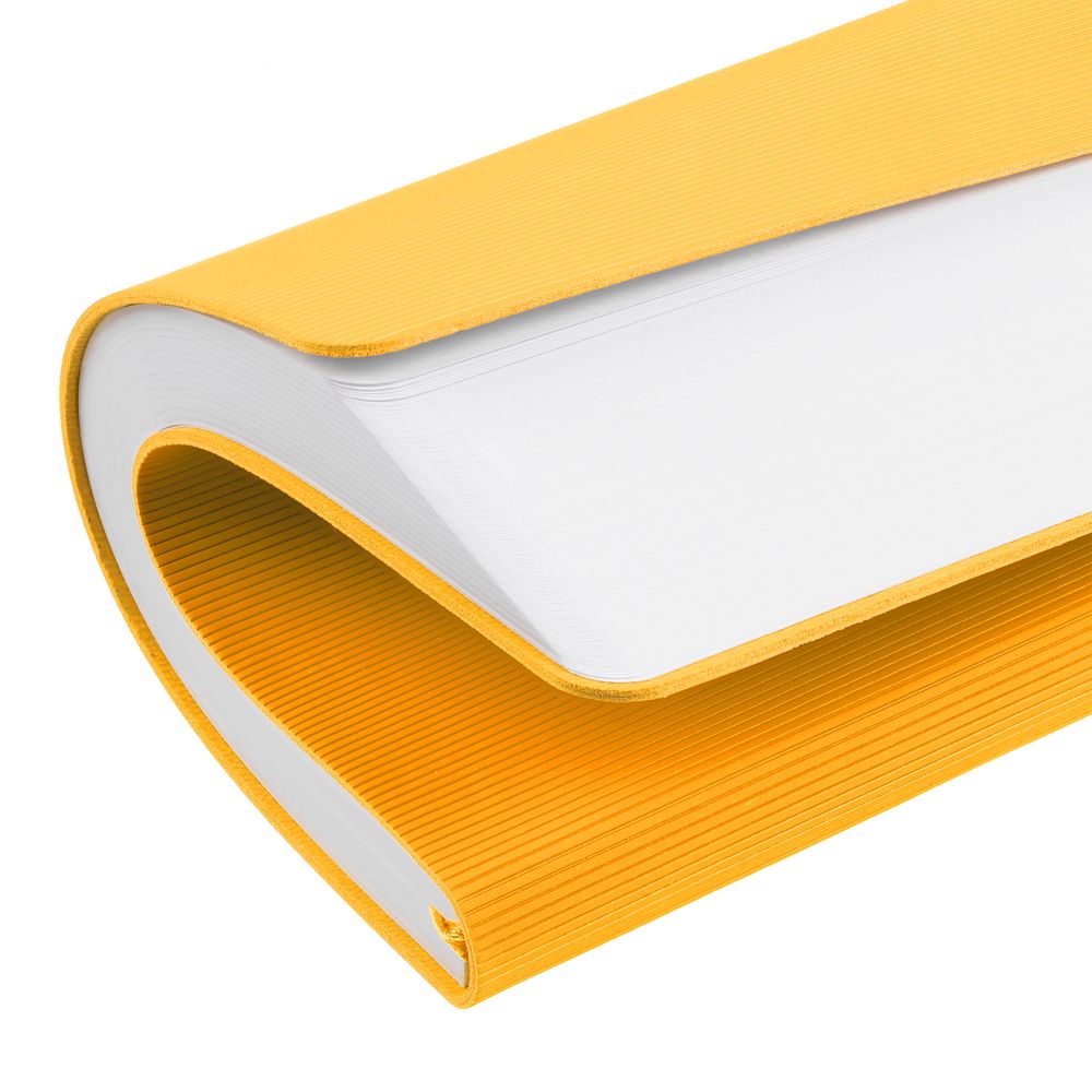 Ежедневник с гибкой обложкой выполнен из материала Soft Touch, желтый KK и Latte, желтый (внутренний материал); дополнен ляссе желтого цвета и фактурным тиснением обложки.