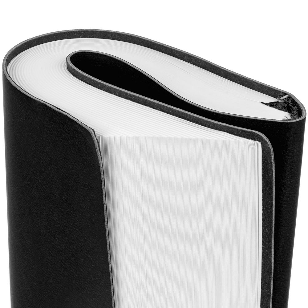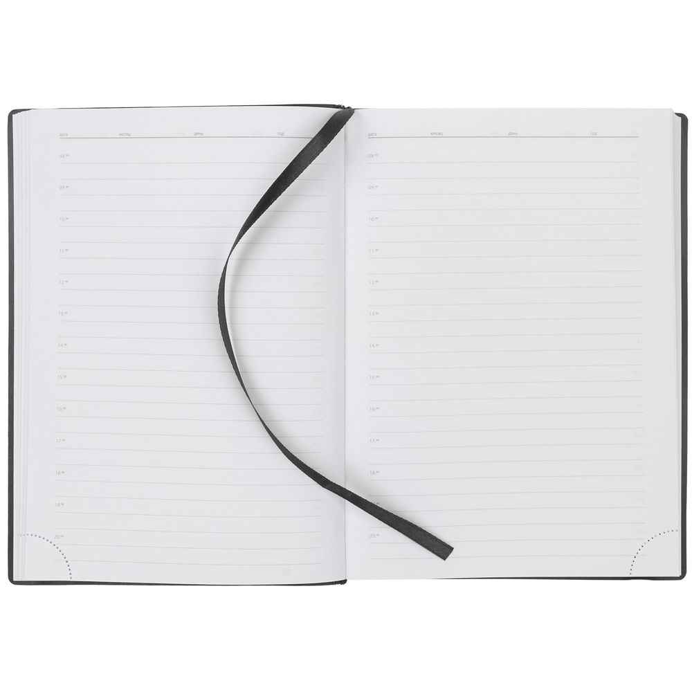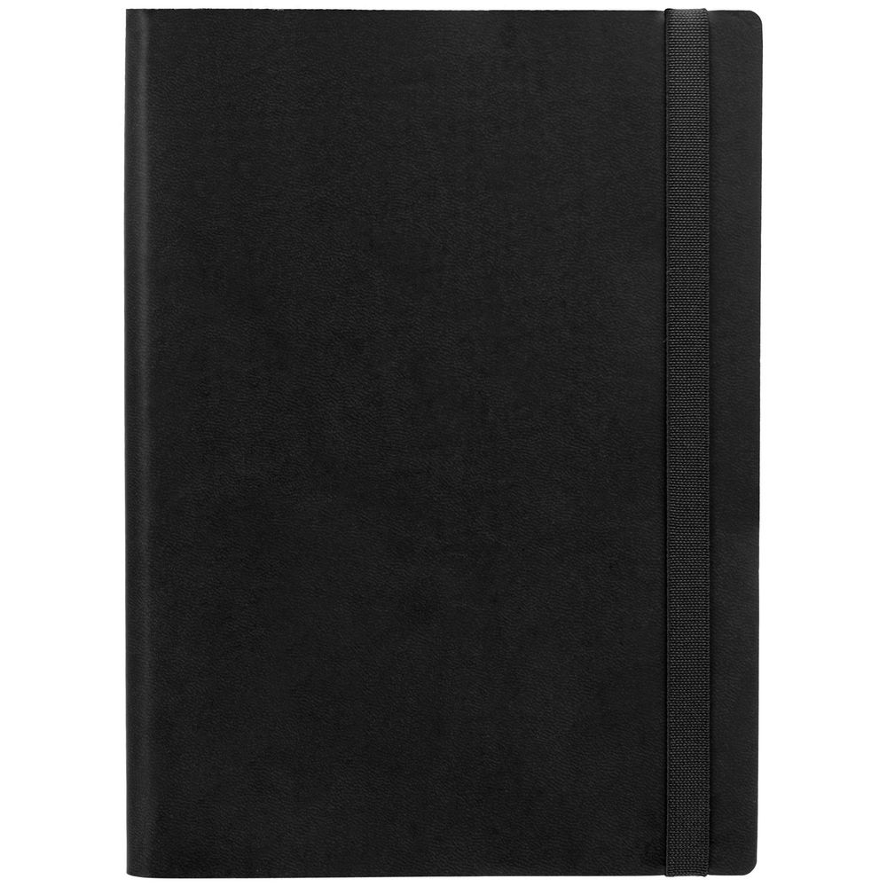 Ежедневник с гибкой обложкой выполнен из материала Latte, черный АА, и дополнен резинкой шириной 1 см, капталом и ляссе черного цвета.