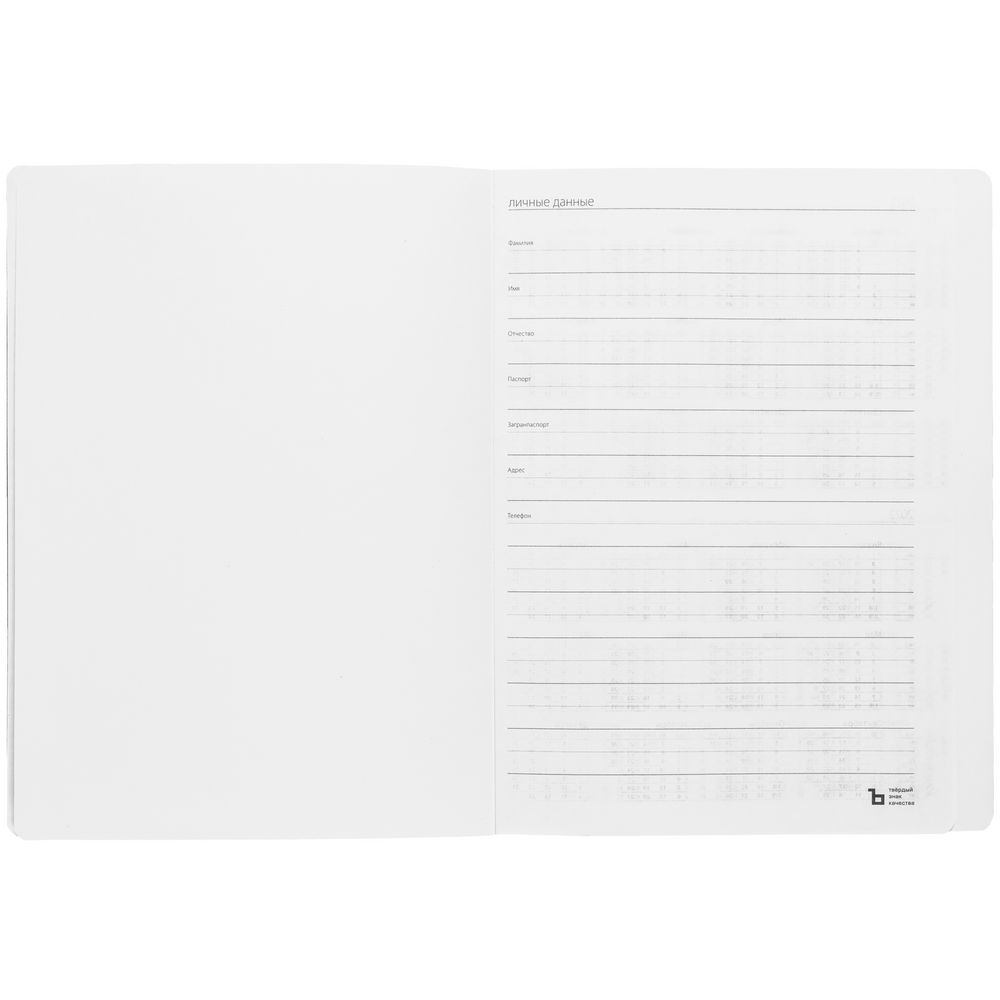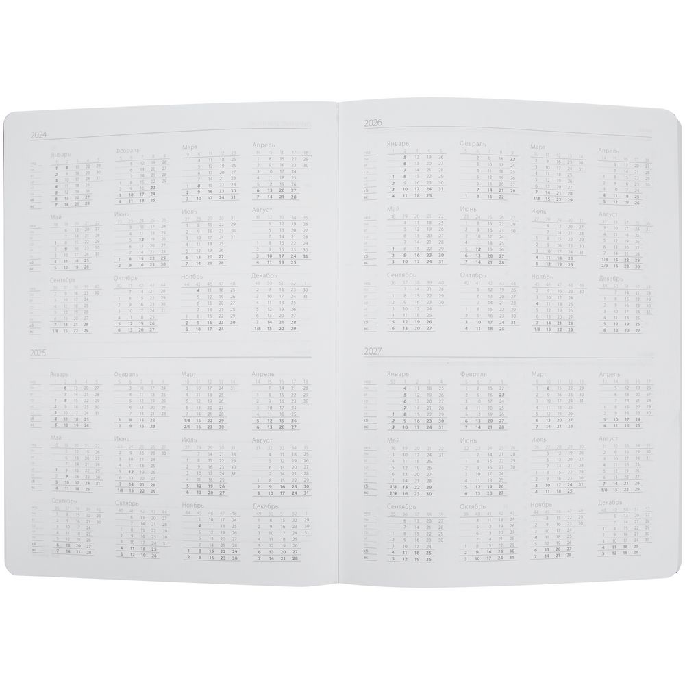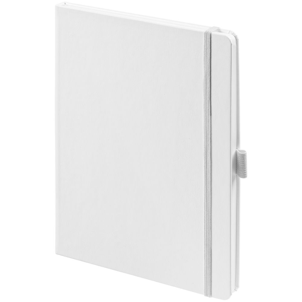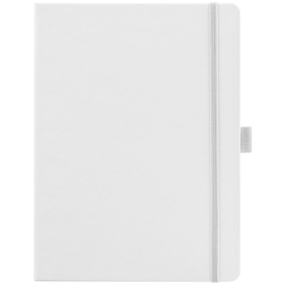 Еженедельник в твердой обложке выполнен из материала Nebraska, белый ВВ, дополнен резинкой, петлей для ручки и ляссе белого цвета.