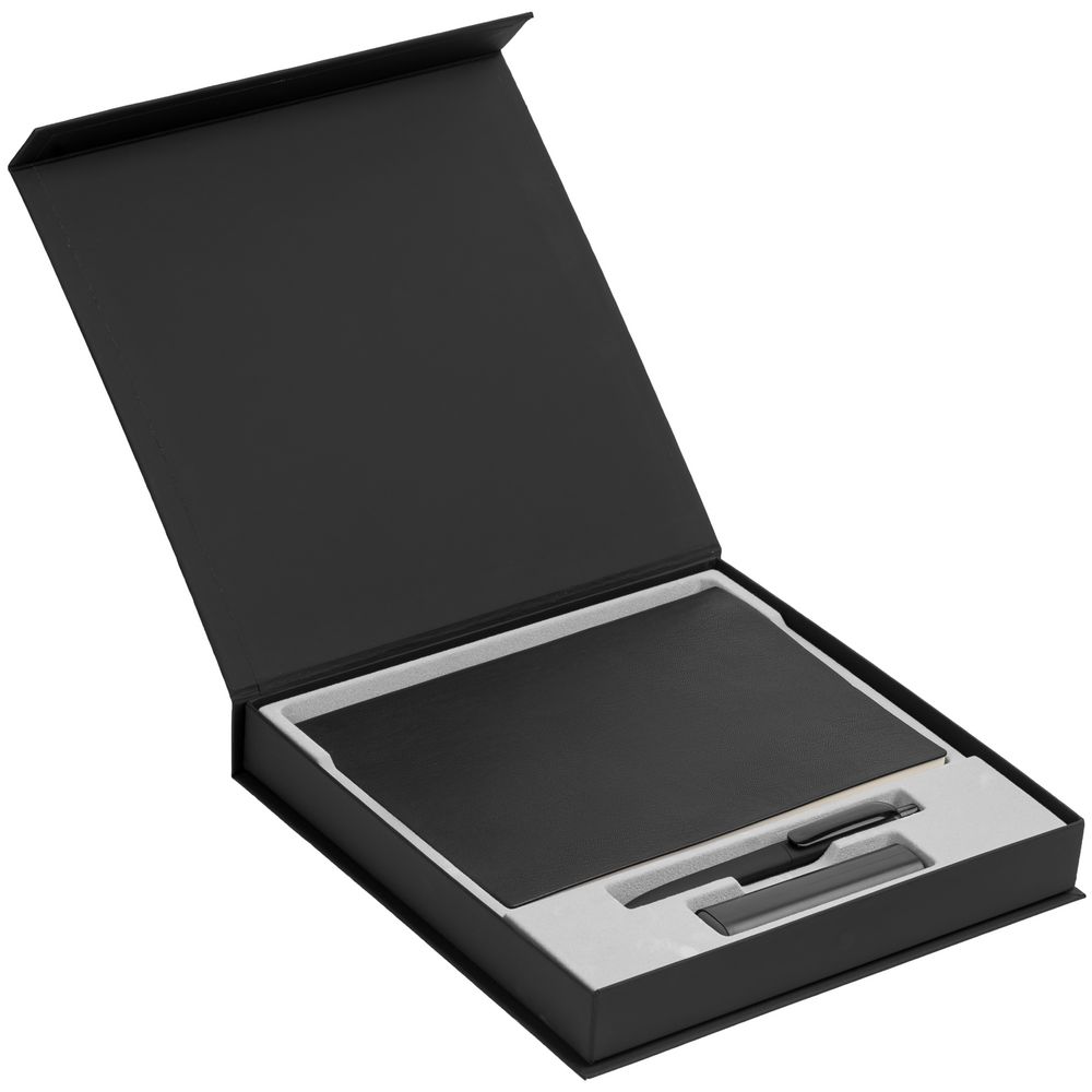 Коробка из переплетного картона, кашированного дизайнерской софт-тач бумагой Senzo, с одной створкой на магните и флокированным ложементом.
