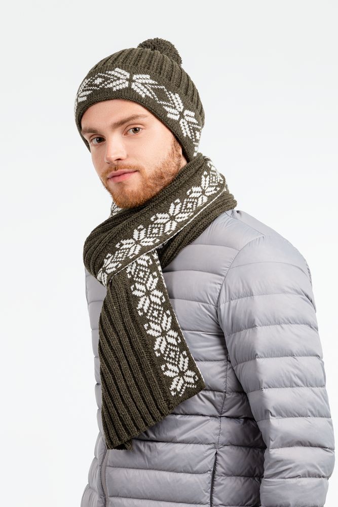Выполнен с совмещением фактурной вязки и жаккардового узора.