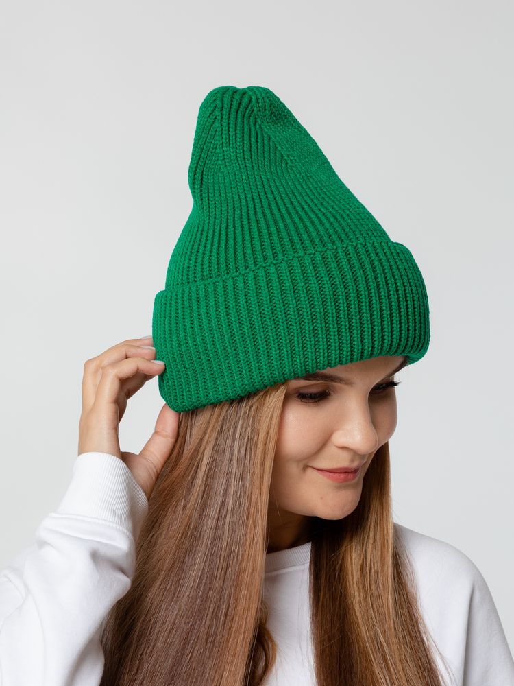 Удлиненная шапка объемной фактурной вязки с отворотом. Поставляется в пакете с липким краем.