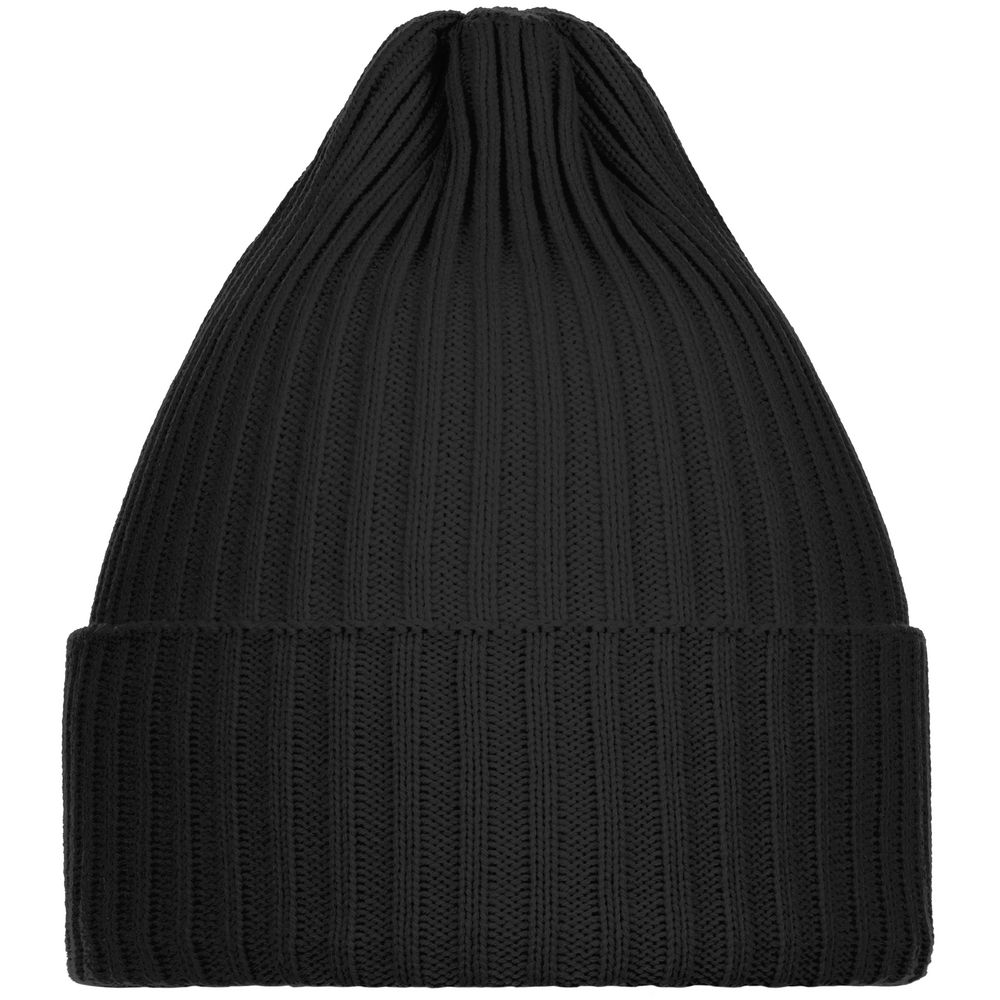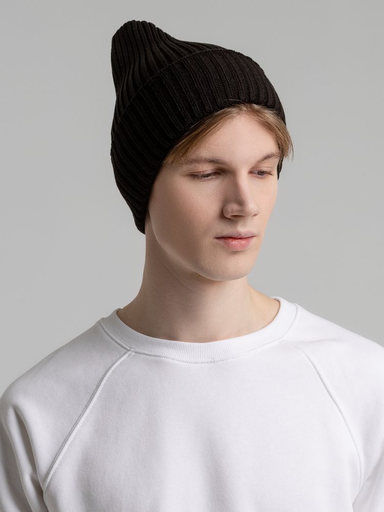 Однослойная шапка фактурной вязки с двойным отворотом.